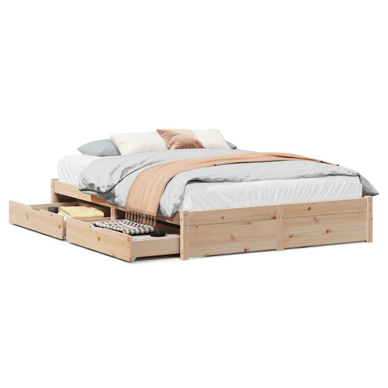 Осигурете си по-добър спокоен нощен сън с тази рамка за легло! Тя представлява приветливо допълнение към всяка спалня. Стабилна и дълготрайна рамка: Масивната борова дървесина е известна със своята здравина и издръжливост. Нейните прави зърна и отличителни възли допринасят за рустик чара ѝ.Решетъчна основа за оптимална опора: Рамката на леглото е оборудвана с решетъчна основа за опора и дишане на вашия матрак.Използвайте пълноценно пространството: Тази рамка за легло разполага с две чекмеджета отдолу, осигуряващи съхранение на предмети като допълнително спално бельо, сезонни дрехи и играчки.Маневреност без усилие: Това чекмедже за съхранение под леглото разполага с четири колелца, осигуряващи плавна и лесна маневреност за плъзгане и изваждане под леглото ви. Добре е да се знае:Към това легло не е включен матрак. Ние предлагаме разнообразна селекция от матраци. Можете да проверите нашия магазин за подходящ матрак.