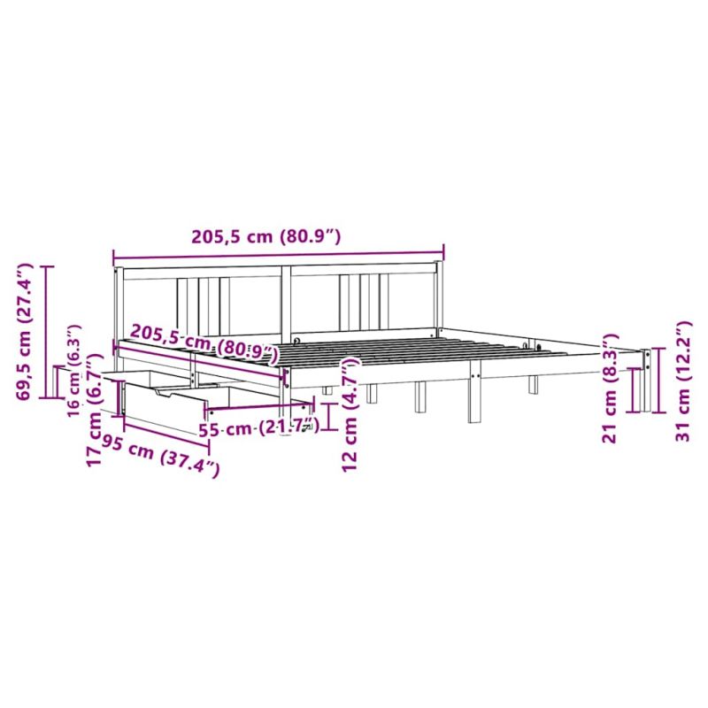 Осигурете си по-добър спокоен нощен сън с тази рамка за легло! Тя представлява приветливо допълнение към всяка спалня. Стабилна и дълготрайна рамка: Масивната борова дървесина е известна със своята здравина и издръжливост. Нейните прави зърна и отличителни възли допринасят за рустик чара ѝ.Решетъчна основа за оптимална опора: Рамката на леглото е оборудвана с решетъчна основа за опора и дишане на вашия матрак.Използвайте пълноценно пространството: Тази рамка за легло разполага с две чекмеджета отдолу, осигуряващи съхранение на предмети като допълнително спално бельо, сезонни дрехи и играчки.Маневреност без усилие: Това чекмедже за съхранение под леглото разполага с четири колелца, осигуряващи плавна и лесна маневреност за плъзгане и изваждане под леглото ви. Добре е да се знае:Към това легло не е включен матрак. Ние предлагаме разнообразна селекция от матраци. Можете да проверите нашия магазин за подходящ матрак.