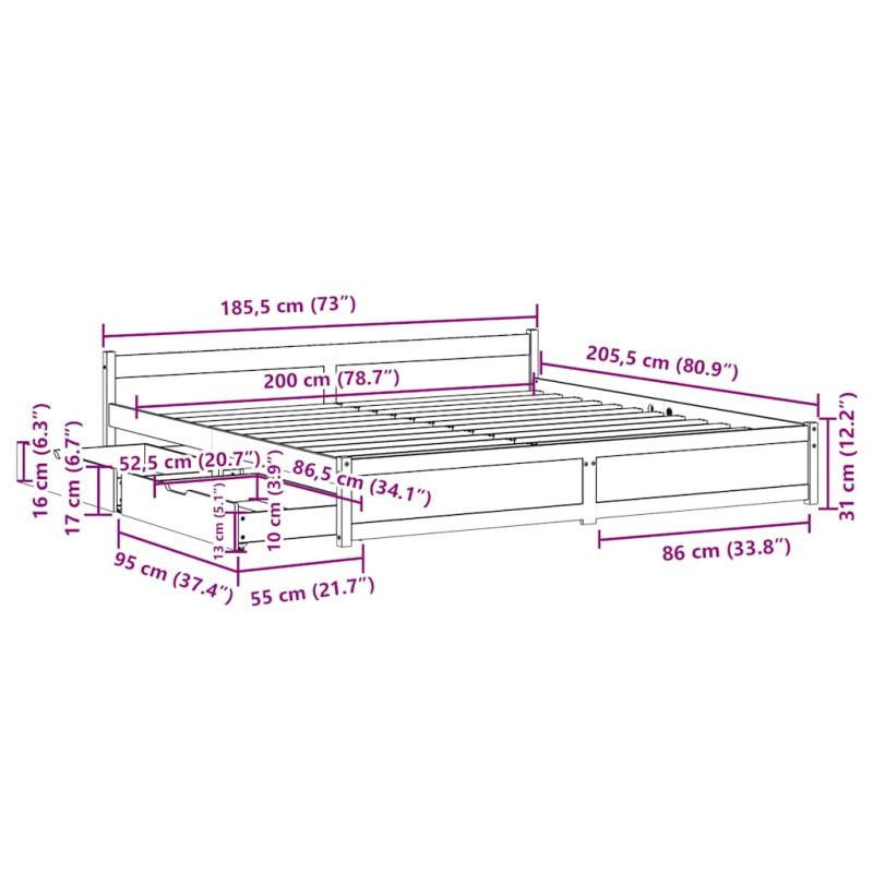 Осигурете си по-добър спокоен нощен сън с тази рамка за легло! Тя представлява приветливо допълнение към всяка спалня. Стабилна и дълготрайна рамка: Масивната борова дървесина е известна със своята здравина и издръжливост. Нейните прави зърна и отличителни възли допринасят за рустик чара ѝ.Решетъчна основа за оптимална опора: Рамката на леглото е оборудвана с решетъчна основа за опора и дишане на вашия матрак.Гъвкава табла: Тази рамка за легло се предлага с табла, която осигурява отлична опора за гърба, когато седите в леглото, за да четете или гледате телевизия, като същевременно служи и като декоративен елемент.Използвайте пълноценно пространството: Тази рамка за легло разполага с две чекмеджета отдолу, осигуряващи съхранение на предмети като допълнително спално бельо, сезонни дрехи и играчки.Маневреност без усилие: Това чекмедже за съхранение под леглото разполага с четири колелца, осигуряващи плавна и лесна маневреност за плъзгане и изваждане под леглото ви. Добре е да се знае:Към това легло не е включен матрак. Ние предлагаме разнообразна селекция от матраци. Можете да проверите нашия магазин за подходящ матрак.