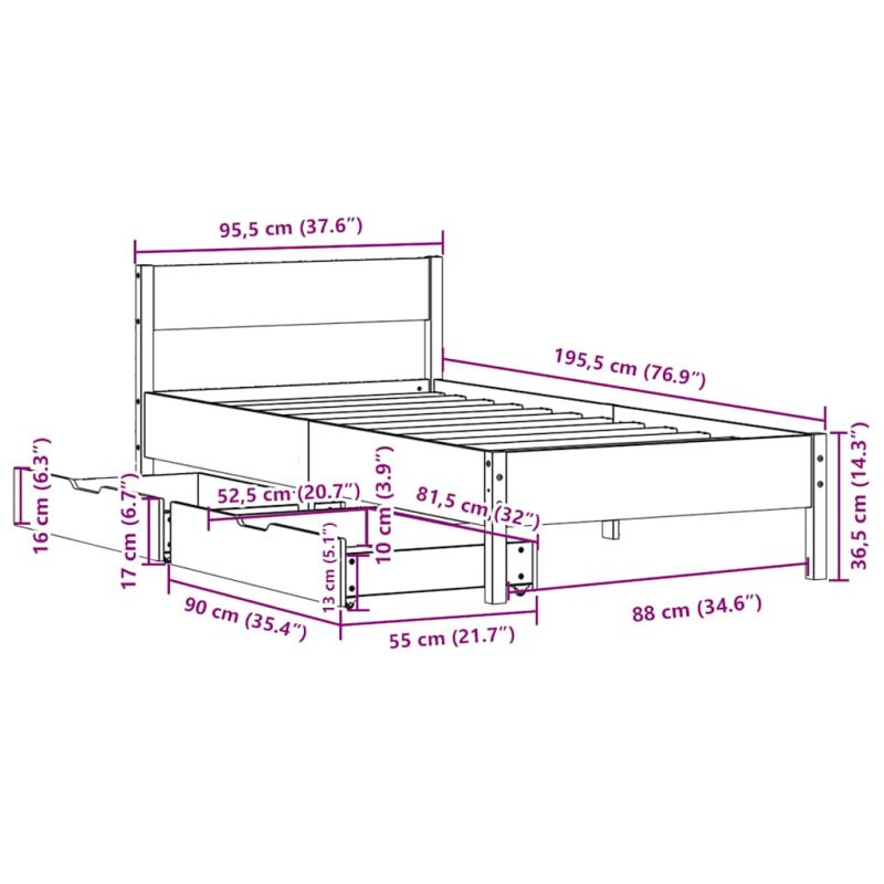 Осигурете си по-добър спокоен нощен сън с тази рамка за легло! Тя представлява приветливо допълнение към всяка спалня. Стабилна и дълготрайна рамка: Масивната борова дървесина е известна със своята здравина и издръжливост. Нейните прави зърна и отличителни възли допринасят за рустик чара ѝ.Решетъчна основа за оптимална опора: Рамката на леглото е оборудвана с решетъчна основа за опора и дишане на вашия матрак.Гъвкава табла: Тази рамка за легло се предлага с табла, която осигурява отлична опора за гърба, когато седите в леглото, за да четете или гледате телевизия, като същевременно служи и като декоративен елемент.Използвайте пълноценно пространството: Тази рамка за легло разполага с две чекмеджета отдолу, осигуряващи съхранение на предмети като допълнително спално бельо, сезонни дрехи и играчки.Маневреност без усилие: Това чекмедже за съхранение под леглото разполага с четири колелца, осигуряващи плавна и лесна маневреност за плъзгане и изваждане под леглото ви. Добре е да се знае:Към това легло не е включен матрак. Ние предлагаме разнообразна селекция от матраци. Можете да проверите нашия магазин за подходящ матрак.