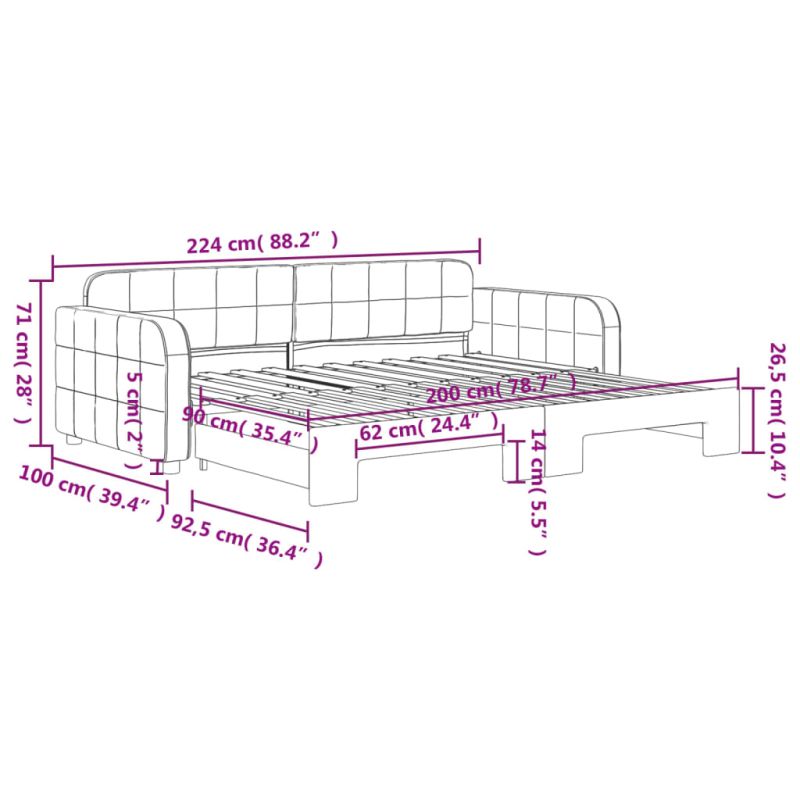 Това канапе 2-в-1 с изтеглящо разтегателно легло, което служи едновременно като диван и легло, е практично и атрактивно допълнение към вашата всекидневна или спалня. Функционална мебел: Канапето функционира като диван през деня и лесно се превръща в двойно легло през нощта чрез издърпване на механизма за изтеглящо разтегателно легло, осигурявайки удобно решение за настаняване на гости и увеличаване на пространството.Меко кадифе: Кадифето е мека и удобна материя, която се усеща приятно върху кожата.Здрава конструкция: Дървената и метална рамка на спалното легло осигурява здравина и стабилност. Добре е да се знае:Матраците не са включени в това легло. Ние предлагаме разнообразна селекция от матраци. Можете да проверите нашия магазин за подходящи матраци.