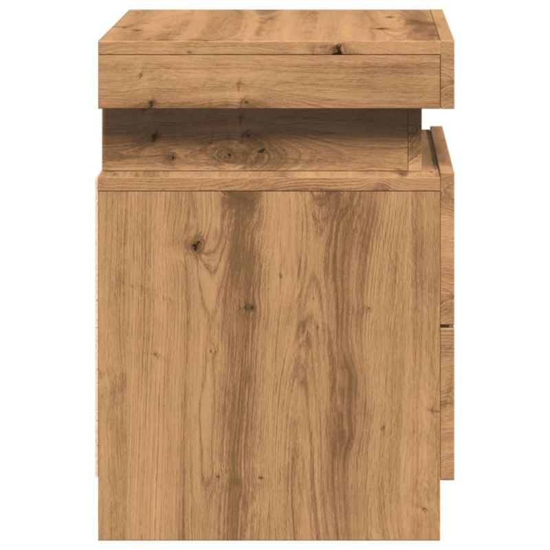 Със стилен дизайн, тези нощни шкафчета се вписват лесно във вашата спалня или всекидневна и придават непреходен чар на вашия интериор. Издръжлив материал: Инженерната дървесина е с изключително качество с гладка повърхност и също така се отличава със здравина, стабилност и устойчивост на влага.Достатъчно място за съхранение: Нощното шкафче с чекмедже предоставя достатъчно място за съхранение, където да държите различни ваши вещи добре организирани и леснодостъпни.RGB LED светлини за приятна атмосфера: Тази крайна маса е снабдена с LED светлини, които могат лесно да се регулират, за да създадат персонализирано светлинно шоу. Можете да персонализирате режимите, цветовете и яркостта, за да подобрите атмосферата на вашето вътрешно пространство.Лесна за поддръжка: Благодарение на гладката си повърхност, нощното шкафче се почиства лесно с влажна кърпа и изисква по-малко поддръжка. Внимание:За да предотвратите преобръщане, този продукт трябва да се използва с предоставеното устройство за закрепване на стена.Добре е да се знае:Продуктът има USB конектор, който изисква сертифициран 5V USB захранващ източник (не е включен).