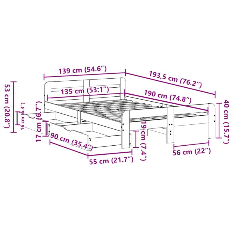 Осигурете си по-добър спокоен нощен сън с тази рамка за легло! Тя представлява приветливо допълнение към всяка спалня. Стабилна и дълготрайна рамка: Масивната борова дървесина е известна със своята здравина и издръжливост. Нейните прави зърна и отличителни възли допринасят за рустик чара ѝ.Решетъчна основа за оптимална опора: Рамката на леглото е оборудвана с решетъчна основа за опора и дишане на вашия матрак.Използвайте пълноценно пространството: Тази основа за легло разполага с две чекмеджета отдолу, осигуряващи съхранение на предмети като допълнително спално бельо, сезонни дрехи и играчки.Гъвкава табла: Тази рамка за легло се предлага с табла, която осигурява отлична опора за гърба, когато седите в леглото, за да четете или гледате телевизия, като същевременно служи и като декоративен елемент.Маневреност без усилие: Това чекмедже за съхранение под леглото разполага с четири колелца, осигуряващи плавна и лесна маневреност за плъзгане и изваждане под леглото ви. Добре е да се знае:Към това легло не е включен матрак. Ние предлагаме разнообразна селекция от матраци. Можете да проверите нашия магазин за подходящ матрак.