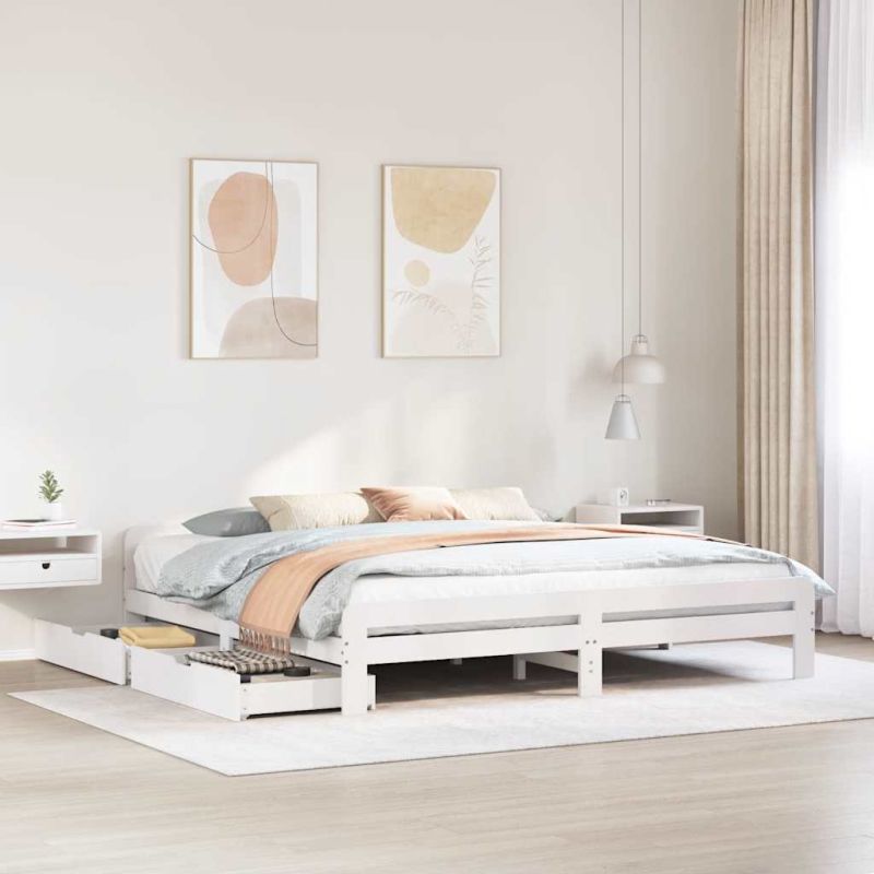 Осигурете си по-добър спокоен нощен сън с тази рамка за легло! Тя представлява приветливо допълнение към всяка спалня. Стабилна и дълготрайна рамка: Масивната борова дървесина е известна със своята здравина и издръжливост. Нейните прави зърна и отличителни възли допринасят за рустик чара ѝ.Решетъчна основа за оптимална опора: Рамката на леглото е оборудвана с решетъчна основа за опора и дишане на вашия матрак.Използвайте пълноценно пространството: Тази основа за легло разполага с две чекмеджета отдолу, осигуряващи съхранение на предмети като допълнително спално бельо, сезонни дрехи и играчки.Гъвкава табла: Тази рамка за легло се предлага с табла, която осигурява отлична опора за гърба, когато седите в леглото, за да четете или гледате телевизия, като същевременно служи и като декоративен елемент.Маневреност без усилие: Това чекмедже за съхранение под леглото разполага с четири колелца, осигуряващи плавна и лесна маневреност за плъзгане и изваждане под леглото ви. Добре е да се знае:Към това легло не е включен матрак. Ние предлагаме разнообразна селекция от матраци. Можете да проверите нашия магазин за подходящ матрак.