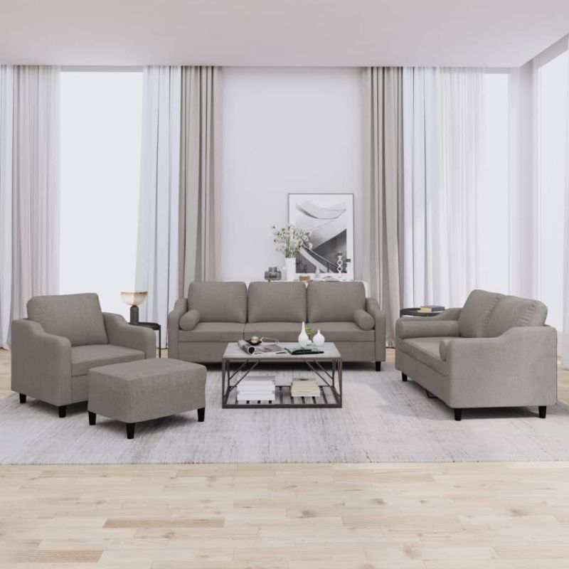 Този комплект дивани е отлично място за вашето време за разговори, четене, гледане на телевизия или просто почивка. Тя е предназначена да бъде фокусна точка във вашия дом. Издръжлив текстил: Материята се отличава със семпъл и изчистен вид, като същевременно остава дишаща и дълготрайна.Здрава и стабилна рамка: Шперплатът и металната рамка на седалката на дивана осигуряват здравина и стабилност. Удобна седалка: Диванът е много удобен с дебело подплатената седалка, подлакътниците и възглавницата за гърба. Практични ролкови възглавници: Тези цилиндрични възглавници не само освежават интериора, но и добавят допълнителен комфорт, докато седите или лежите. Функционална табуретка: Табуретката е подходяща за повдигане за крака, когато лежите на дивана, или ви предлага допълнително място за сядане във вашата стая. Освен това семплият дизайн и компактният размер я правят идеална за сядане почти навсякъде в жилищното ви пространство.