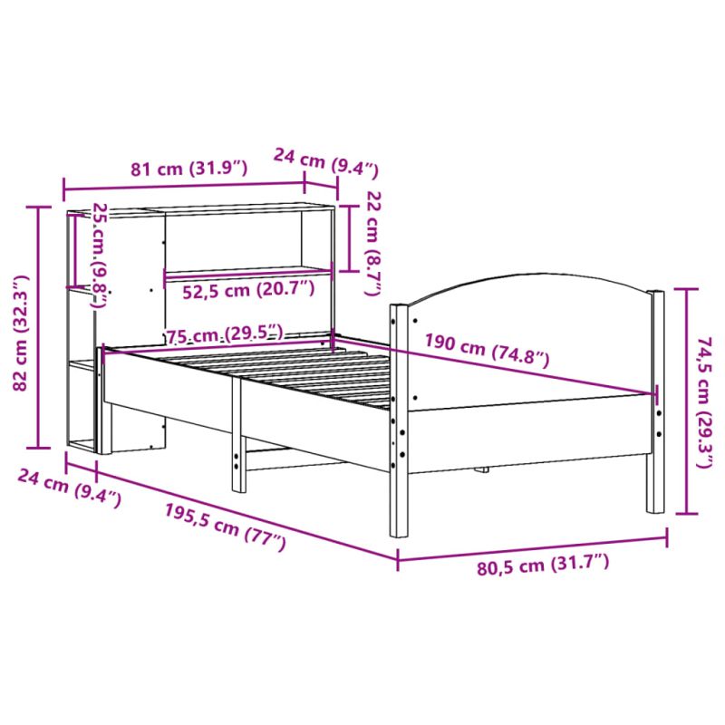 Легло с рафтове за книги, без матрак, 75x190 см, бор масив