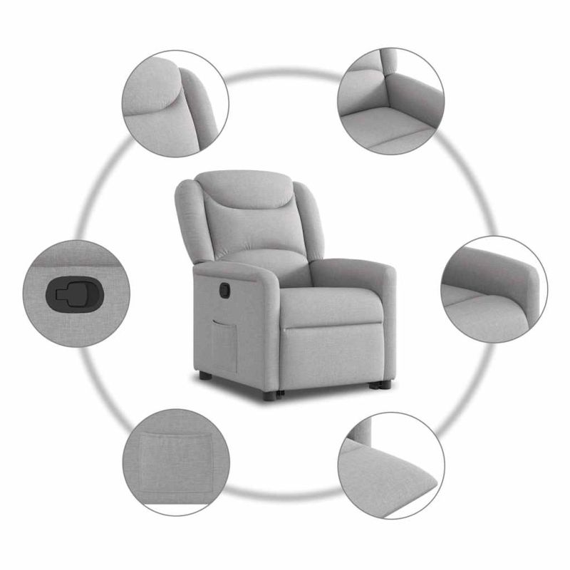 Облегнете се и се отпуснете в този изключително комфортен изправящ наклоняем стол! Функция за повдигане: Този стол реклайнер е оборудван с електрически двигател с функция за повдигане. Благодарение на функцията, която избутва целия стол нагоре, можете лесно да стоите, без да натоварвате гърба и коленете си с просто натискане на бутона.Функция за ръчно накланяне: Този накланящ се стол има дръжка от дясната страна. Можете ръчно да настроите поставката за крака и облегалката до произволна позиция според вашето удобство с просто издърпване на дръжката. Тази функция позволява максимален наклон от 135 градуса. Освен това облегалката може бързо да се върне на първоначалното си място с лесно издърпване на дръжката.Удобно седене: Дебело подплатената седалка, облегалка и широки подлакътници, покрити с текстил, осигуряват уютно и топло усещане, което ви кара да се чувствате като в прегръдка, докато седите. Тъканта се отличава със семпъл и изчистен вид и е дишаща и издръжлива.Удобен страничен джоб: Този фотьойл има страничен джоб, за да държите основните си вещи леснодостъпни.Здрава и стабилна рамка: Рамката, изработена от дърво и метал, осигурява здрава структура и стабилност. Този накланящ се фотьойл е удобен и издръжлив. Този уред може да се използва от деца над 8 години и лица с намалени физически, сензорни или ментални възможности или липса на опит и знания под надзор или ако са получили инструкции относно употребата на уреда по безопасен начин и разбират възможните опасности. Децата не трябва да си играят с уреда. Почистването и потребителската поддръжка не трябва да се извършват от деца без надзор. Захранването трябва да бъде само с безопасно изключително ниско напрежение, съответстващо на маркировката върху уреда. Включете USB конектора на уреда в USB гнездото на захранването. Моля, обърнете внимание да се използва само сертифицирано захранване DC 5V. По-високото напрежение може да доведе до прегряване и до повреда на устройството, както и до потенциален риск от пожар.