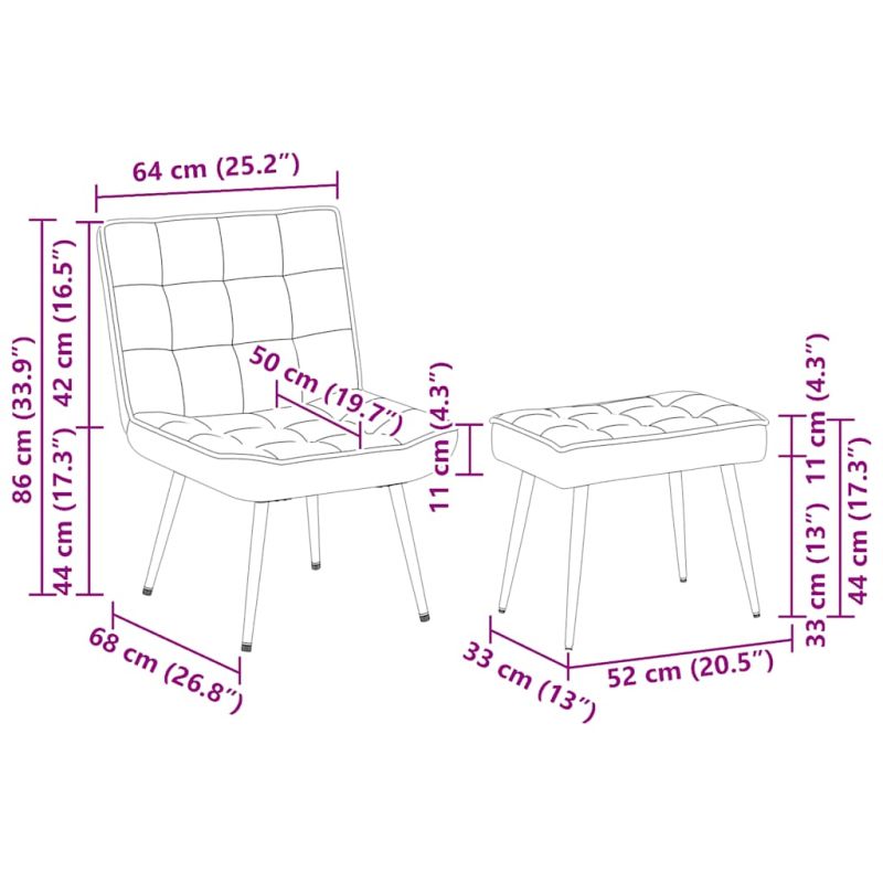 Насладете се на оптимален комфорт при сядане след натоварен ден на този уютен релакс стол с табуретка! Меко и уютно: Кадифето е мека и удобна материя, която се усеща приятно върху кожата.Здрава и стабилна рамка: Рамките от метал и шперплат осигуряват издръжливост и стабилност.Удобно седене: Меката тапицерия на седалката предлага максимален комфорт и опора, осигурявайки приятно усещане при седене.Удобна облегалка: Облегалката предлага допълнителна опора и комфорт.Универсална употреба: Този кадифен стол е многофункционално и стилно допълнение към всеки дом или офис за отдих. Независимо дали ще го поставите близо до дивана в дневната или ще създадете уютен кът в спалнята или кабинета, той ще подобри естетиката на вашето жилищно пространство. Добре е да се знае:Всеки продукт се доставя с ръководство за сглобяване в кашона за лесно сглобяване.