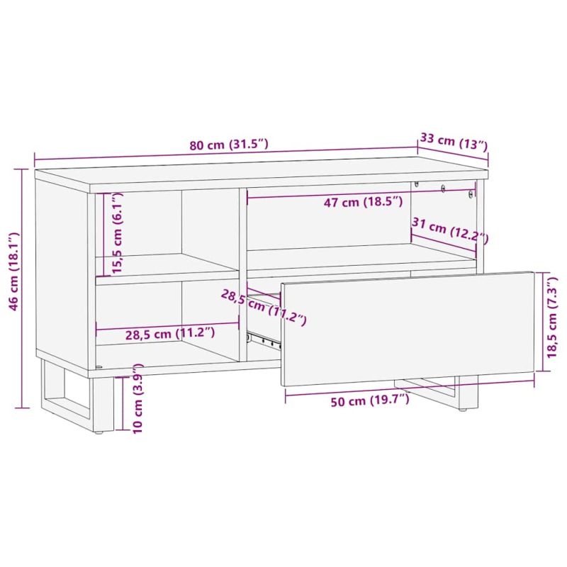Този ТВ шкаф с достатъчно място за съхранение е практично и атрактивно допълнение към вашата всекидневна или спалня. Здрав и стабилен материал: Масивното мангово дърво, здрава тропическа твърда дървесина, е силно предпочитано за производството на мебели поради изключителната си издръжливост и здравина. Красивите ѝ дървесни шарки правят всяка мебел малко по-различна от следващите.Метални крака: Металните крака добавят спокоен стил към вашия интериор, като същевременно осигуряват стабилност.Достатъчно място за съхранение: Този ТВ шкаф осигурява достатъчно място за съхранение на вашите списания, книги, DVD дискове и мултимедийни устройства добре организирани и на достъпно място.Здрав и стабилен плот: Здравият плот е идеален за поставяне на вашия телевизор и стерео уредби или на различни декоративни елементи, като вази или саксийни растения. Добре е да се знае:Всеки артикул е уникален с вариации в цветове и зърна. Доставката е на случаен принцип, което гарантира ексклузивността и индивидуалността на вашия продукт.
