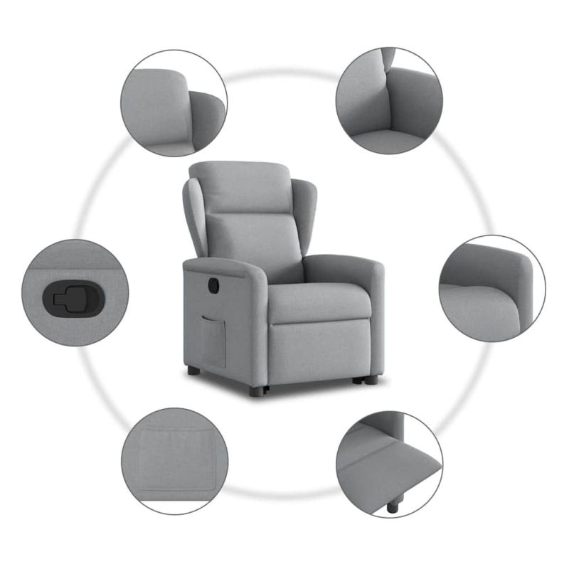 Облегнете се и се отпуснете в този изключително комфортен изправящ наклоняем стол! Функция за повдигане: Този стол реклайнер е оборудван с електрически двигател с функция за повдигане. Благодарение на функцията, която избутва целия стол нагоре, можете лесно да стоите, без да натоварвате гърба и коленете си с просто натискане на бутона.Функция за ръчно накланяне: Този накланящ се стол има дръжка от дясната страна. Можете ръчно да настроите поставката за крака и облегалката до произволна позиция според вашето удобство с просто издърпване на дръжката. Тази функция позволява максимален наклон от 135 градуса. Освен това облегалката може бързо да се върне на първоначалното си място с лесно издърпване на дръжката.Удобно седене: Дебело подплатената седалка, облегалка и широки подлакътници, покрити с текстил, осигуряват уютно и топло усещане, което ви кара да се чувствате като в прегръдка, докато седите. Тъканта се отличава със семпъл и изчистен вид и е дишаща и издръжлива.Удобен страничен джоб: Този фотьойл има страничен джоб, за да държите основните си вещи леснодостъпни.Здрава и стабилна рамка: Рамката, изработена от дърво и метал, осигурява здрава структура и стабилност. Този накланящ се фотьойл е удобен и издръжлив. Този уред може да се използва от деца над 8 години и лица с намалени физически, сензорни или ментални възможности или липса на опит и знания под надзор или ако са получили инструкции относно употребата на уреда по безопасен начин и разбират възможните опасности. Децата не трябва да си играят с уреда. Почистването и потребителската поддръжка не трябва да се извършват от деца без надзор. Захранването трябва да бъде само с безопасно изключително ниско напрежение, съответстващо на маркировката върху уреда. Включете USB конектора на уреда в USB гнездото на захранването. Моля, обърнете внимание да се използва само сертифицирано захранване DC 5V. По-високото напрежение може да доведе до прегряване и до повреда на устройството, както и до потенциален риск от пожар.