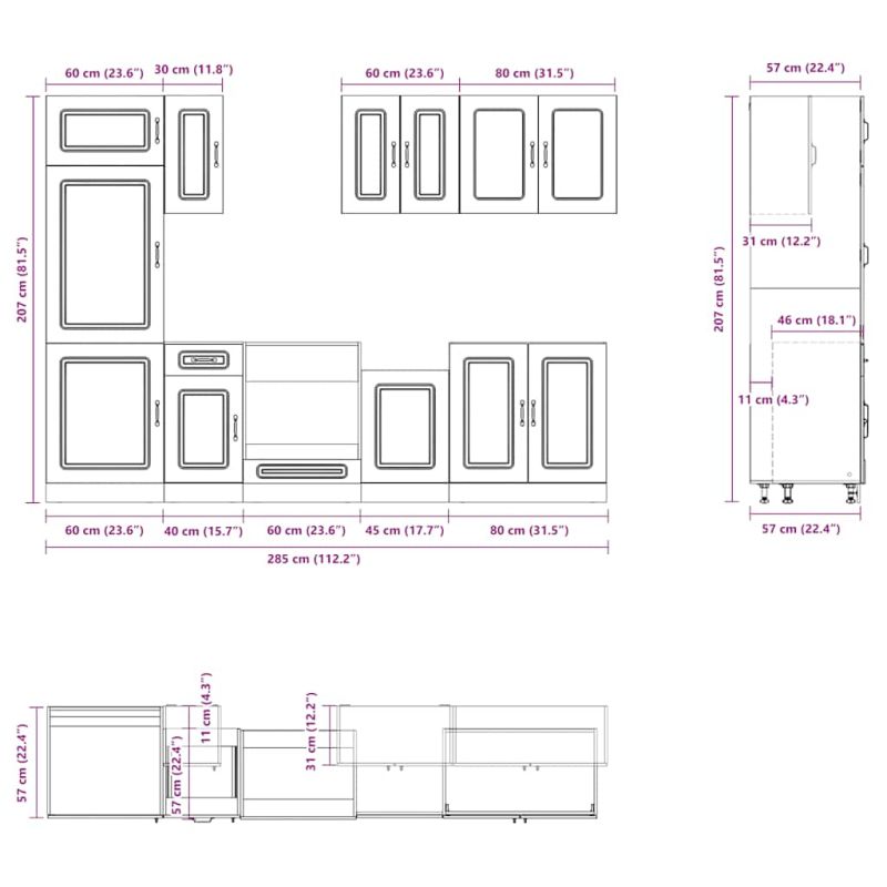 Този комплект кухненски шкафове от 8 части, с елегантния си дизайн, оптимизира кухненското ви пространство и осигурява достатъчно място за съхранение на вашите лични вещи! Стабилен и издръжлив материал: Инженерната дървесина е издръжлив и стабилен материал с гладка повърхност, устойчива на влага, деформация и цепене, което го прави надежден избор за различни проекти.Достатъчно място за съхранение: Комплектът кухненски шкафове има много отделения и предлага достатъчно място за съхранение на купи, чинии, тенджери и други кухненски уреди.Регулируеми крачета: Долните шкафове разполагат с регулируеми крачета, които могат да се регулират по височина, за да отговарят на оформлението на вашата кухня.Лесни за поддръжка: Благодарение на гладката си повърхност, тези кухненски шкафове се почистват лесно с влажна кърпа и изискват по-малко поддръжка. Предупреждение:Този продукт трябва да бъде обезопасен чрез монтиране на работен плот. Подходящ за имайте предвид:Винт(ове) и дюбели за вътрешната част на стената не са включени. Потърсете и използвайте винт(ове) и дюбели, подходящи за вашите стени. Ако не сте сигурни, потърсете професионален съвет. Прочетете и следвайте внимателно всяка стъпка от инструкциите.Плотът, мивката и смесителят не са включени в доставката.