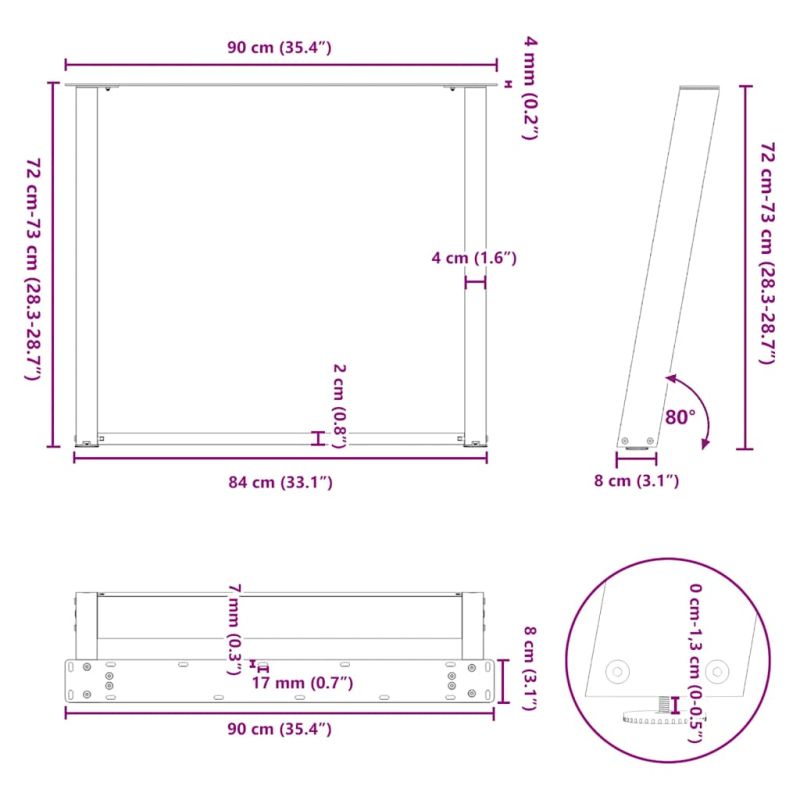 Тези крака за трапезарна маса съчетават форма и функция. Това е идеален избор за персонализиране на вашата трапезарна маса. Издръжлив материал: Този крак за мебелна маса е изработен от прахово боядисана стомана, което го прави здрав и дълготраен.Здрава конструкция: Наклоненият под ъгъл от 80 градуса дизайн на металния крак на масата гарантира, че той може да поддържа тежък плот.Практичен дизайн: Този крак за трапезарна маса включва регулируеми нивелири, осигуряващи стабилност дори на неравни подове и минимизиращи драскотините по пода. Освен това, скобата е с предварително пробити отвори и включени в доставката винтове, които могат да се използват за закрепване на крака към плота на масата (не са включени), което улеснява сглобяването.Модерна естетика: Кракът на масата има изчистени линии и геометричен дизайн, за да подобри цялостния вид на мебелите. И се съчетава добре с всеки плот за маса с подходящ размер. Полезно е да знаете:Доставката съдържа само крака за маса, плотът не е включен.