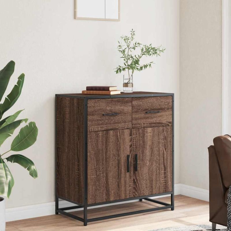 Този модерен бюфет, отличаващ се с непреходен външен вид, е предназначен да бъде отлично допълнение към вашия дом. Стабилна и дълготрайна рамка: Металната рамка на шкафа за съхранение подчертава интериора ви с индустриален стил и осигурява изключителна издръжливост, стабилност и устойчивост на корозия.Стабилен и издръжлив материал: Инженерната дървесина е издръжлив и стабилен материал с гладка повърхност, която е устойчива на влага, изкривяване и разцепване, което я прави надежден избор за различни проекти.Голямо пространство за съхранение: Бюфетът предлага достатъчно място за съхранение на основни неща за хранене и други домакински вещи, за да бъдат те подредени и достъпни.Практични дръжки: Шкафът за коридор е снабден с дръжки, които осигуряват удобен захват, помагат за лесното отваряне и затваряне на шкафа и придават допълнителна красота.Широки приложения: Можете да използвате този страничен шкаф като шкаф за баня или кухненски шкаф, или просто като елегантен шкаф за съхранение в спални, мокри помещения, входни пространства, коридори и офиси, трапезарии и други жилищни помещения. Внимание:За да предотвратите преобръщане, този продукт трябва да се използва с предоставеното устройство за закрепване на стена.