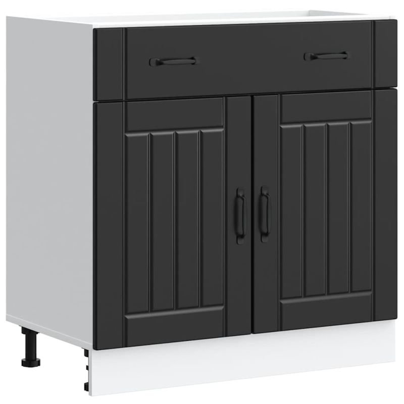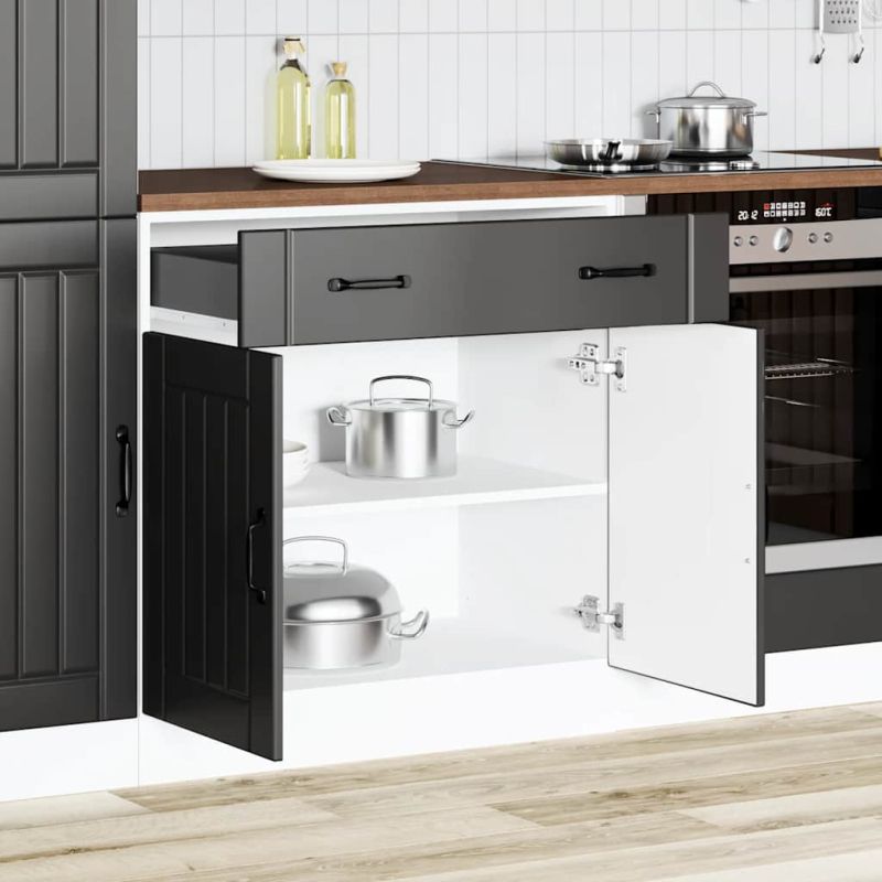 Този кухненски шкаф оптимизира пространството в кухнята ви, като осигурява достатъчно място за съхранение на личните ви вещи! Стабилен и издръжлив материал: Инженерната дървесина е издръжлив и стабилен материал с гладка повърхност, която е устойчива на влага, изкривяване и разцепване, което я прави надежден избор за различни проекти.Голямо пространство за съхранение: Шкафът за мивка предлага достатъчно място за съхранение на чинии, чинии, тенджери и други кухненски уреди.Практични врати: Вратата помага за поддържането на чисто и организирано пространство, като скрива кухненските уреди и разхвърляните вещи зад тях.Регулируеми крачета: Крачетата на този шкаф могат да се регулират по височина, за да отговарят на разположението на кухнята ви.Лесна поддръжка: Благодарение на гладката си повърхност този кухненски шкаф се почиства лесно с влажна кърпа и изисква по-малко поддръжка. Внимание:За да предотвратите преобръщане, този продукт трябва да се използва с предоставеното устройство за закрепване на стена. Добре е да се знае:Винт(ове) и щепсел(и) за вътрешността на стената не са включени. Търсете и използвайте винт(ове) и дюбел(и), подходящи за вашите стени. Ако не сте сигурни, потърсете професионална помощ. Прочетете и следвайте внимателно всяка стъпка от инструкциите.