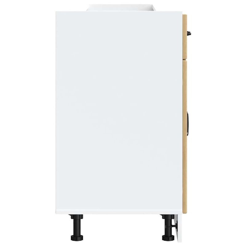 Този кухненски шкаф оптимизира пространството в кухнята ви, като осигурява достатъчно място за съхранение на личните ви вещи! Стабилен и издръжлив материал: Инженерната дървесина е издръжлив и стабилен материал с гладка повърхност, която е устойчива на влага, изкривяване и разцепване, което я прави надежден избор за различни проекти.Голямо пространство за съхранение: Шкафът за мивка предлага достатъчно място за съхранение на чинии, чинии, тенджери и други кухненски уреди.Практични врати: Вратата помага за поддържането на чисто и организирано пространство, като скрива кухненските уреди и разхвърляните вещи зад тях.Регулируеми крачета: Крачетата на този шкаф могат да се регулират по височина, за да отговарят на разположението на кухнята ви.Лесна поддръжка: Благодарение на гладката си повърхност този кухненски шкаф се почиства лесно с влажна кърпа и изисква по-малко поддръжка. Внимание:За да предотвратите преобръщане, този продукт трябва да се използва с предоставеното устройство за закрепване на стена. Добре е да се знае:Винт(ове) и щепсел(и) за вътрешността на стената не са включени. Търсете и използвайте винт(ове) и дюбел(и), подходящи за вашите стени. Ако не сте сигурни, потърсете професионална помощ. Прочетете и следвайте внимателно всяка стъпка от инструкциите.