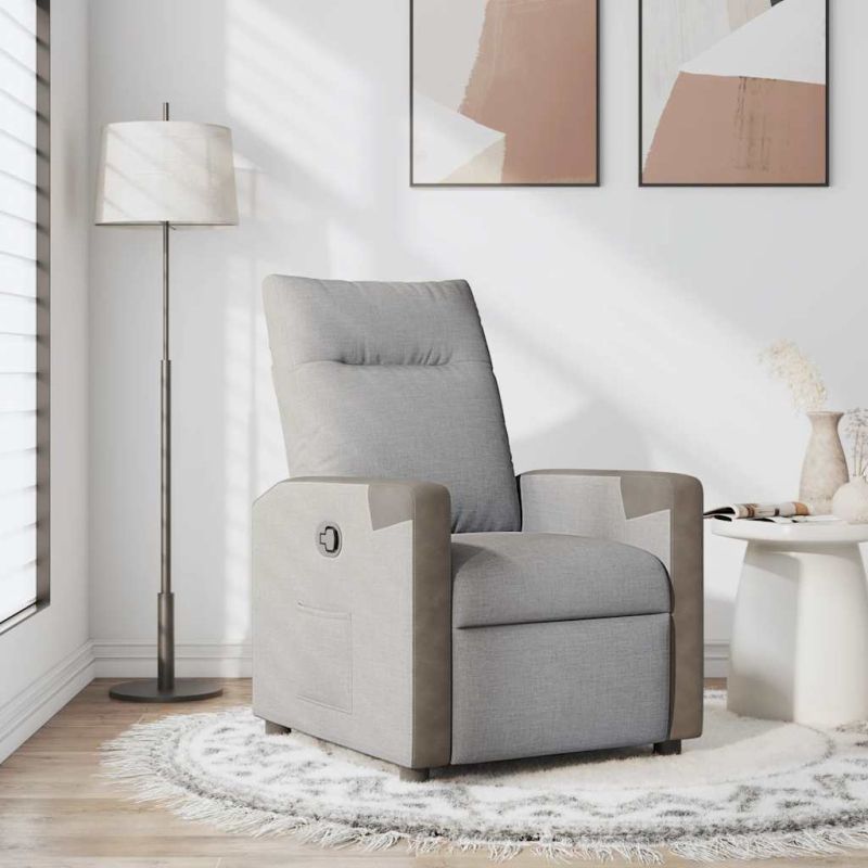 Облегнете се и се отпуснете в този изключително комфортен наклоняем стол! Функция за ръчно накланяне: Този накланящ се стол има дръжка от дясната страна. Можете ръчно да настроите поставката за крака и облегалката до произволна позиция според вашето удобство с просто издърпване на дръжката. Тази функция позволява максимален наклон от 135 градуса. Освен това облегалката може бързо да се върне на първоначалното си място с лесно издърпване на дръжката.Удобно седене: Дебело подплатената седалка, облегалката и широките подлакътници, покрити с текстил, осигуряват уютно и топло усещане, което ви кара да се чувствате като в прегръдка, докато седите. Тъканта се отличава със семпъл и изчистен вид и е дишаща и издръжлива.Удобен страничен джоб: Този фотьойл има страничен джоб за вашето дистанционно управление или за поддържане на вашите основни вещи леснодостъпни.Здрава и стабилна рамка: Рамката, изработена от дърво и метал, осигурява здрава структура и стабилност. Този накланящ се фотьойл е удобен и издръжлив.