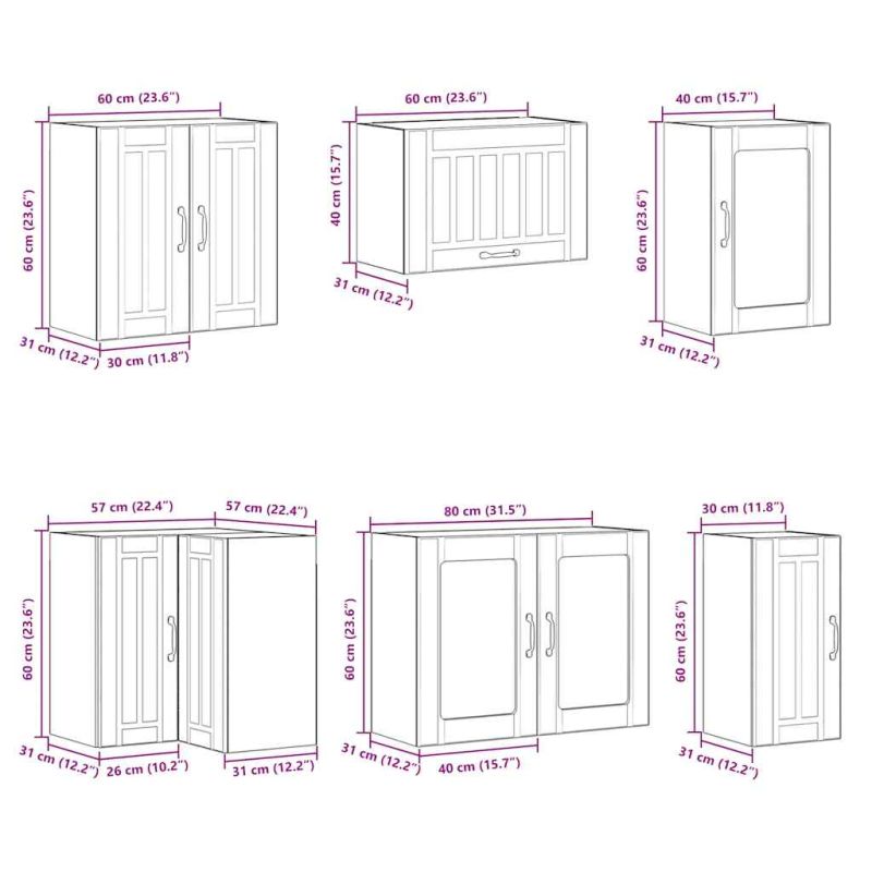 Този комплект кухненски шкафове от 11 части с елегантния си дизайн оптимизира кухненското ви пространство и осигурява достатъчно място за съхранение на вещите ви! Стабилен и издръжлив материал: Инженерната дървесина е издръжлив и стабилен материал с гладка повърхност, която е устойчива на влага, изкривяване и разцепване, което я прави надежден избор за различни проекти.Голямо пространство за съхранение: Комплектът кухненски шкафове има много отделения и предлага достатъчно място за съхранение на купи, чинии, тенджери и други кухненски уреди.Регулируеми крачета: Долните шкафове са снабдени с регулируеми крачета, чиято височина може да се регулира според разположението на кухнята.Лесна поддръжка: Благодарение на гладката си повърхност тези кухненски шкафове се почистват лесно с влажна кърпа и изискват по-малко поддръжка. Внимание:За да предотвратите преобръщане, този продукт трябва да се използва с предоставеното устройство за закрепване на стена. Добре е да се знае:Винт(ове) и щепсел(и) за вътрешността на стената не са включени. Търсете и използвайте винт(ове) и дюбел(и), подходящи за вашите стени. Ако не сте сигурни, потърсете професионална помощ. Прочетете и следвайте внимателно всяка стъпка от инструкциите.Работният плот, мивката и смесителят не са включени в доставката.