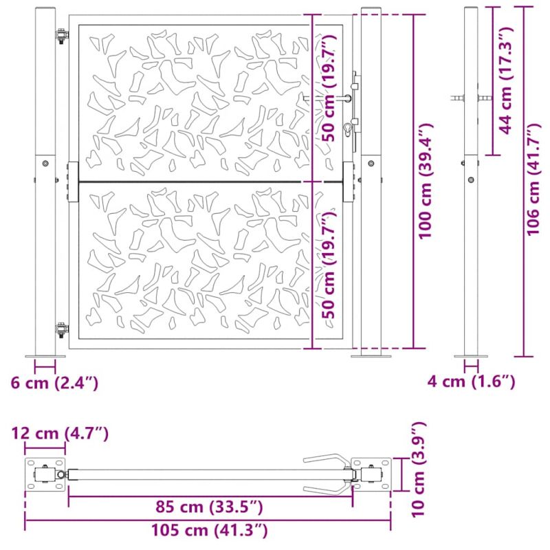 Тази градинска порта, отличаваща се с перфектна комбинация от здравина и елегантност, е идеална врата за оградата около вашата градина или вътрешен двор. Издръжлив материал: Стоманата е изключително твърд и здрав материал. Тя предлага здравина и стабилност. Поцинковането осигурява по-добра защита срещу корозия и е полезно за продукти, които ще се използват на открито, както и при неблагоприятни условия. А праховото покритие върху стоманата създава защитен слой срещу износване.Лазерно изрязан дизайн: Оградната порта има красив лазерно изрязан дизайн, който добавя уникален чар към вашия дом.Заключваща се конструкция: Външната порта е оборудвана със стабилна система за заключване, която се предлага с три подходящи ключа, гарантиращи сигурното заключване на портата за вътрешен двор.Лесна за сглобяване: Входната врата се предлага в комплект с два стълба с фланцови плочи и монтажни аксесоари за лесен монтаж.Широки приложения: Металната порта е идеална за подобряване на градински входове, алеи и всякакви граници на имота, като съчетава функционалност и визуална привлекателност.