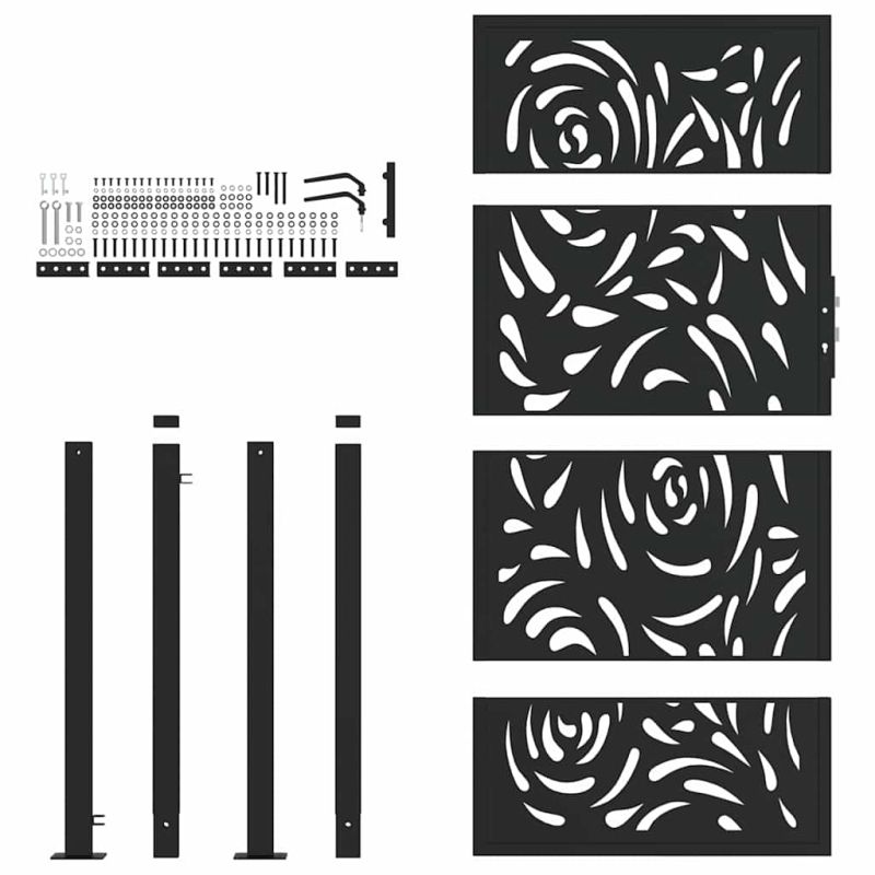 Тази градинска порта, отличаваща се с перфектна комбинация от здравина и елегантност, е идеална врата за оградата около вашата градина или вътрешен двор. Издръжлив материал: Стоманата е изключително твърд и здрав материал. Тя предлага здравина и стабилност. Поцинковането осигурява по-добра защита срещу корозия и е полезно за продукти, които ще се използват на открито, както и при неблагоприятни условия. А праховото покритие върху стоманата създава защитен слой срещу износване.Лазерно изрязан дизайн: Оградната порта има красив лазерно изрязан дизайн, който добавя уникален чар към вашия дом.Заключваща се конструкция: Външната порта е оборудвана със стабилна система за заключване, която се предлага с три подходящи ключа, гарантиращи сигурното заключване на портата за вътрешен двор.Лесна за сглобяване: Входната врата се предлага в комплект с два стълба с фланцови плочи и монтажни аксесоари за лесен монтаж.Широки приложения: Металната порта е идеална за подобряване на градински входове, алеи и всякакви граници на имота, като съчетава функционалност и визуална привлекателност.