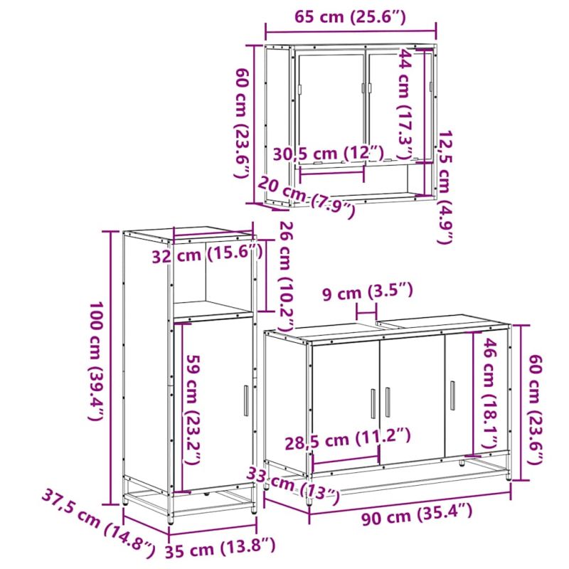 Комплект шкафове за баня от 3 части дъб сонома инженерно дърво