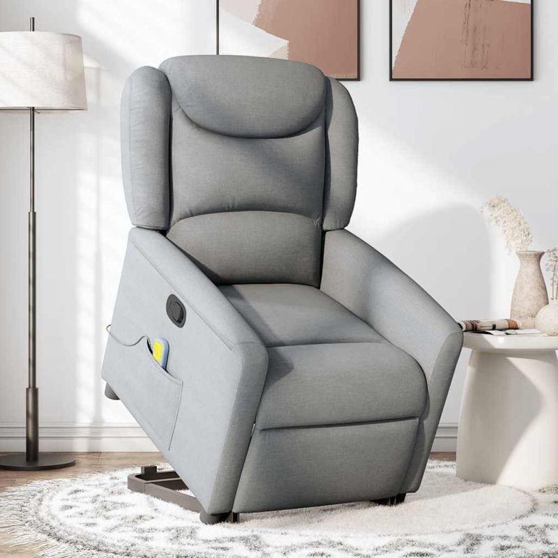 Облегнете се и се отпуснете в този изключително комфортен изправящ масажен и наклоняем стол! Функция за повдигане: Този стол реклайнер е оборудван с електрически двигател с функция за повдигане. Благодарение на функцията, която избутва целия стол нагоре, можете лесно да стоите, без да натоварвате гърба и коленете си с просто натискане на бутона.Функция за ръчно накланяне: Този накланящ се стол има дръжка от дясната страна. Можете ръчно да настроите поставката за крака и облегалката до произволна позиция според вашето удобство с просто издърпване на дръжката. Тази функция позволява максимален наклон от 135 градуса. Освен това облегалката може бързо да се върне на първоначалното си място с лесно издърпване на дръжката.Функция за вибрация: Представените 6 масажни точки ви позволяват да изпитате по-целенасочен масаж. Освен това включеното ръчно управление ви позволява да избирате различни програми за масаж. Функцията за масаж се захранва от USB конектор, който изисква сертифициран 5V USB захранващ източник (не е включен).Удобно седене: Дебело подплатената седалка, облегалката и широките подлакътници, покрити с текстил, осигуряват уютно и топло усещане, което ви кара да се чувствате като в прегръдка, докато седите. Тъканта се отличава със семпъл и изчистен вид и е дишаща и издръжлива.Удобни поставки за чаши и страничен джоб: Този фотьойл разполага с две удобни поставки за чаши за вашите напитки и страничен джоб за вашето дистанционно управление или за поддържане на вашите основни вещи леснодостъпни.Здрава и стабилна рамка: Рамката, изработена от дърво и метал, осигурява здрава структура и стабилност. Този накланящ се фотьойл е удобен и издръжлив. Този уред може да се използва от деца над 8 години и лица с намалени физически, сензорни или ментални възможности или липса на опит и знания под надзор или ако са получили инструкции относно употребата на уреда по безопасен начин и разбират възможните опасности. Децата не трябва да си играят с уреда. Почистването и потребителската поддръжка не трябва да се извършват от деца без надзор. Захранването трябва да бъде само с безопасно изключително ниско напрежение, съответстващо на маркировката върху уреда. Включете USB конектора на уреда в USB гнездото на захранването. Моля, обърнете внимание да се използва само сертифицирано захранване DC 5V. По-високото напрежение може да доведе до прегряване и до повреда на устройството, както и до потенциален риск от пожар.