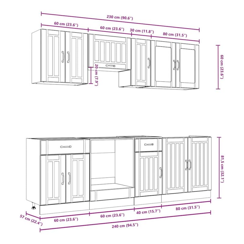 Този комплект кухненски шкафове от 8 части, с елегантния си дизайн, оптимизира кухненското ви пространство и осигурява достатъчно място за съхранение на вашите лични вещи! Стабилен и издръжлив материал: Инженерната дървесина е издръжлив и стабилен материал с гладка повърхност, устойчива на влага, деформация и цепене, което го прави надежден избор за различни проекти.Достатъчно място за съхранение: Комплектът кухненски шкафове има много отделения и предлага достатъчно място за съхранение на купи, чинии, тенджери и други кухненски уреди.Регулируеми крачета: Долните шкафове разполагат с регулируеми крачета, които могат да се регулират по височина, за да отговарят на оформлението на вашата кухня.Лесни за поддръжка: Благодарение на гладката си повърхност, тези кухненски шкафове се почистват лесно с влажна кърпа и изискват по-малко поддръжка. Предупреждение:Този продукт трябва да бъде обезопасен чрез монтиране на работен плот. Подходящ за имайте предвид:Винт(ове) и дюбели за вътрешната част на стената не са включени. Потърсете и използвайте винт(ове) и дюбели, подходящи за вашите стени. Ако не сте сигурни, потърсете професионален съвет. Прочетете и следвайте внимателно всяка стъпка от инструкциите.Плотът, мивката и смесителят не са включени в доставката.
