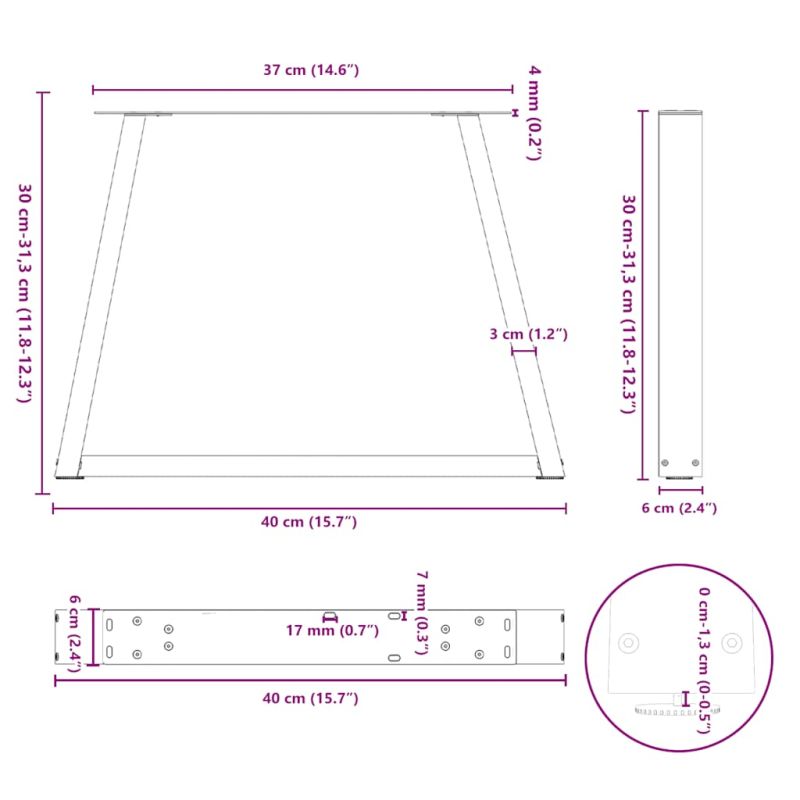 Тези крака за масичка за кафе съчетават форма и функция. Това е идеален избор за персонализиране на вашата масичка за кафе. Издръжлив материал: Този крак за масичка за кафе е изработен от прахово боядисана стомана, което го прави здрав и дълготраен.Практичен дизайн: Този крак за масичка за кафе включва регулируеми нивелири, осигуряващи стабилност дори на неравни подове и минимизиращи драскотините по пода. Освен това, скобата е с предварително пробити отвори и включени в доставката винтове, които могат да се използват за закрепване на крака към плота на масата (не са включени), което улеснява сглобяването.Модерна естетика: Кракът на масата предлага елегантен и съвременен вид. Изчистените му линии и геометричен дизайн подобряват цялостния вид на мебелите. Полезно е да знаете:Доставката съдържа само крака за маса, плотът на масата не е включен.