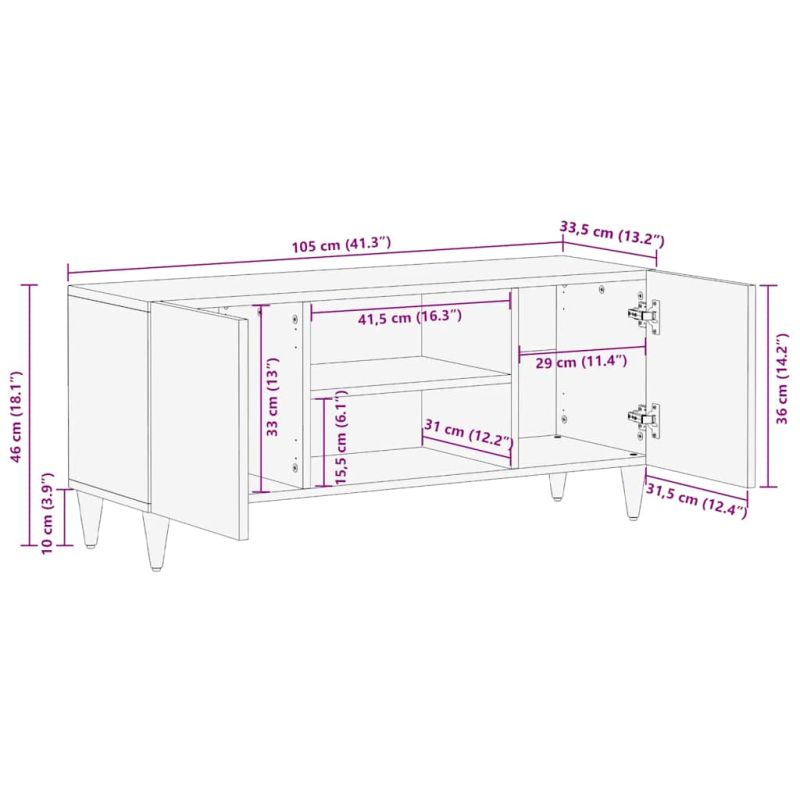Този ТВ шкаф с достатъчно място за съхранение е практично и атрактивно допълнение към вашата всекидневна или спалня. Здрав и стабилен материал: Масивното мангово дърво, здрава тропическа твърда дървесина, е силно предпочитано за производството на мебели поради изключителната си издръжливост и здравина. Красивите ѝ дървесни шарки правят всяка мебел малко по-различна от следващите.Голямо пространство за съхранение: Тази поставка за телевизор осигурява достатъчно място за съхранение, за да държите списанията, книгите, DVD дисковете и мултимедийните устройства добре подредени и на една ръка разстояние.Здрав и стабилен плот: Здравият плот е идеален за поставяне на вашия телевизор и стерео уредби или на различни декоративни елементи, като вази или саксийни растения.С крака: Повдигнатите крачета улесняват почистването под масичката за телевизор, поддържат спретнат вид и осигуряват по-добър въздушен поток около електронното оборудване. Добре е да се знае:Всеки артикул е уникален с вариации в цветове и зърна. Доставката е на случаен принцип, което гарантира ексклузивността и индивидуалността на вашия продукт.