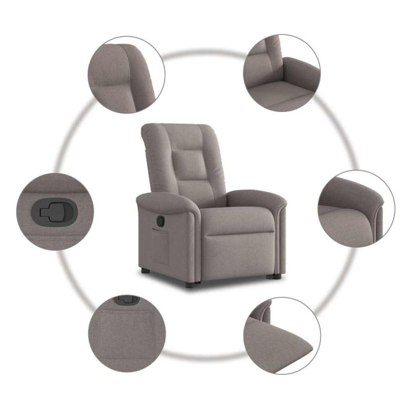 Облегнете се и се отпуснете в този изключително комфортен изправящ наклоняем стол! Функция за повдигане: Този стол реклайнер е оборудван с електрически двигател с функция за повдигане. Благодарение на функцията, която избутва целия стол нагоре, можете лесно да стоите, без да натоварвате гърба и коленете си с просто натискане на бутона.Функция за ръчно накланяне: Този накланящ се стол има дръжка от дясната страна. Можете ръчно да настроите поставката за крака и облегалката до произволна позиция според вашето удобство с просто издърпване на дръжката. Тази функция позволява максимален наклон от 135 градуса. Освен това облегалката може бързо да се върне на първоначалното си място с лесно издърпване на дръжката.Удобно седене: Дебело подплатената седалка, облегалка и широки подлакътници, покрити с текстил, осигуряват уютно и топло усещане, което ви кара да се чувствате като в прегръдка, докато седите. Тъканта се отличава със семпъл и изчистен вид и е дишаща и издръжлива.Удобен страничен джоб: Този фотьойл има страничен джоб, за да държите основните си вещи леснодостъпни.Здрава и стабилна рамка: Рамката, изработена от дърво и метал, осигурява здрава структура и стабилност. Този накланящ се фотьойл е удобен и издръжлив. Този уред може да се използва от деца над 8 години и лица с намалени физически, сензорни или ментални възможности или липса на опит и знания под надзор или ако са получили инструкции относно употребата на уреда по безопасен начин и разбират възможните опасности. Децата не трябва да си играят с уреда. Почистването и потребителската поддръжка не трябва да се извършват от деца без надзор. Захранването трябва да бъде само с безопасно изключително ниско напрежение, съответстващо на маркировката върху уреда. Включете USB конектора на уреда в USB гнездото на захранването. Моля, обърнете внимание да се използва само сертифицирано захранване DC 5V. По-високото напрежение може да доведе до прегряване и до повреда на устройството, както и до потенциален риск от пожар.