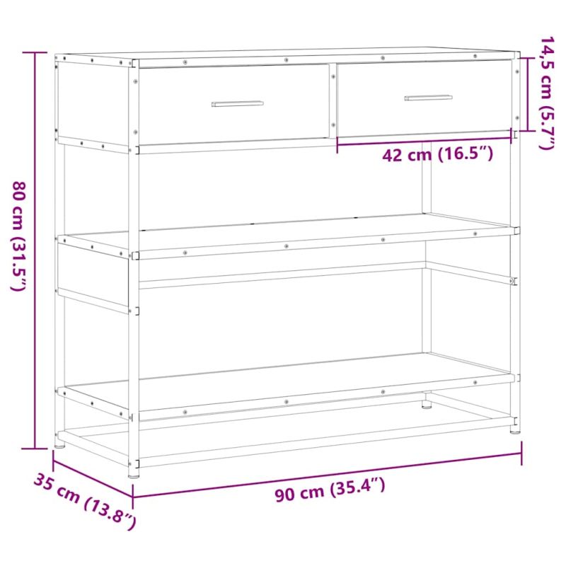 Тази конзолна масичка предлага достатъчно място за съхранение, като същевременно допълва декора на дома ви. Тя е идеална за всекидневната, спалнята и коридорите. Стабилен и издръжлив материал: Инженерната дървесина е издръжлив и стабилен материал с гладка повърхност, която е устойчива на влага, изкривяване и разцепване, което я прави надежден избор за различни проекти.Стабилна и дълготрайна рамка: Металната рамка на масичката за диван подчертава интериора ви с индустриален стил и осигурява изключителна издръжливост, стабилност и устойчивост на корозия.Голямо пространство за съхранение: Тази холна маса има чекмеджета и рафтове, които осигуряват място за съхранение на списания, книги, дистанционни управления и други дребни предмети на една ръка разстояние.Здрав плот: Масата в коридора има здрав плот, върху който можете да поставите храна или напитки, или да изложите декоративни предмети като рамки за снимки или дори саксийни растения.Лесна поддръжка: Благодарение на гладката си повърхност стойката за коридор се почиства лесно с влажна кърпа и изисква по-малко поддръжка. Внимание:За да предотвратите преобръщане, този продукт трябва да се използва с предоставеното устройство за закрепване на стена.