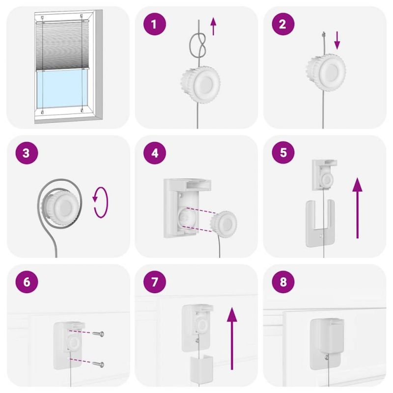 ВНИМАНИЕ!Малките деца могат да бъдат удушени от примки в дърпащи въжета, вериги, ленти и вътрешния кабел, който управлява този продукт. За да избегнете удушаване и оплитане, дръжте кабелите далеч от обсега на малки деца. Шнурите могат да се увият около врата на детето. Преместете леглата, креватчетата и мебелите далеч от въжетата за покриване на прозорци. Не завързвайте кабелите заедно. Уверете се, че кабелите не се усукват и образуват примка. ВНИМАНИЕ!Децата могат да се удушат, ако това предпазно устройство не е монтирано и регулирано. Прочетете внимателно инструкциите и инсталирайте съответно. GPSR