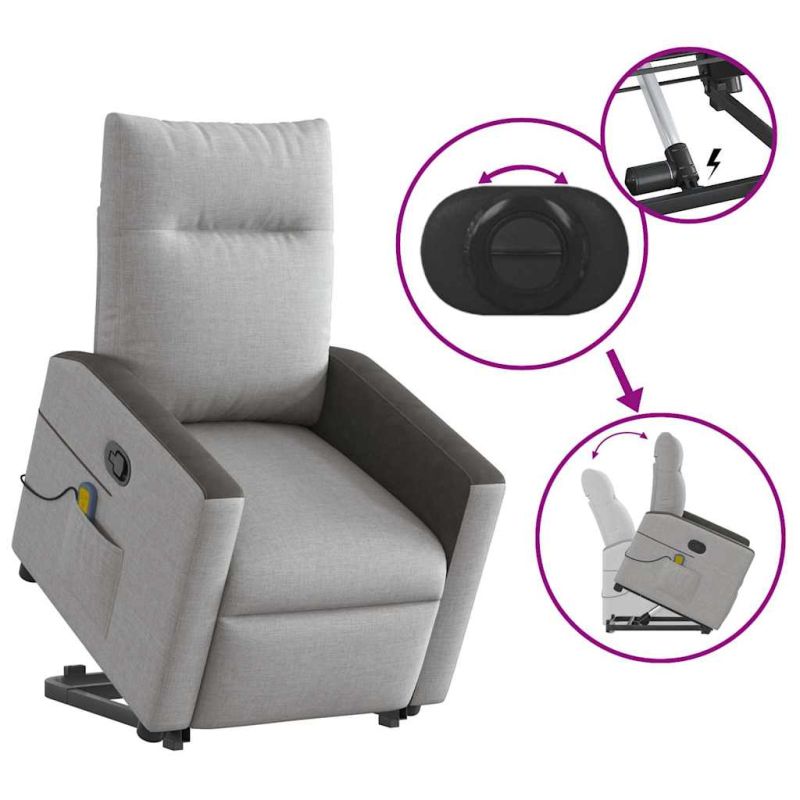 Облегнете се и се отпуснете в този изключително комфортен изправящ масажен и наклоняем стол! Функция за повдигане: Този стол реклайнер е оборудван с електрически двигател с функция за повдигане. Благодарение на функцията, която избутва целия стол нагоре, можете лесно да стоите, без да натоварвате гърба и коленете си с просто натискане на бутона.Функция за ръчно накланяне: Този накланящ се стол има дръжка от дясната страна. Можете ръчно да настроите поставката за крака и облегалката до произволна позиция според вашето удобство с просто издърпване на дръжката. Тази функция позволява максимален наклон от 135 градуса. Освен това облегалката може бързо да се върне на първоначалното си място с лесно издърпване на дръжката.Функция за вибрация: Представените 6 масажни точки ви позволяват да изпитате по-целенасочен масаж. Освен това включеното ръчно управление ви позволява да избирате различни програми за масаж. Функцията за масаж се захранва от USB конектор, който изисква сертифициран 5V USB захранващ източник (не е включен).Удобно седене: Дебело подплатената седалка, облегалката и широките подлакътници, покрити с текстил, осигуряват уютно и топло усещане, което ви кара да се чувствате като в прегръдка, докато седите. Тъканта се отличава със семпъл и изчистен вид и е дишаща и издръжлива.Удобен страничен джоб: Този фотьойл има страничен джоб, за да държите основните си вещи леснодостъпни.Здрава и стабилна рамка: Рамката, изработена от дърво и метал, осигурява здрава структура и стабилност. Този накланящ се фотьойл е удобен и издръжлив. Този уред може да се използва от деца на възраст от 8 години и нагоре, както и от лица с намалени физически, сетивни или умствени способности, или с липса на опит и познания, ако са получили надзор или инструкции относно използването на уреда по безопасен начин и разбират съществуващите опасности. Децата не трябва да си играят с уреда. Децата не трябва да почистват и да извършват потребителска поддръжка без надзор.