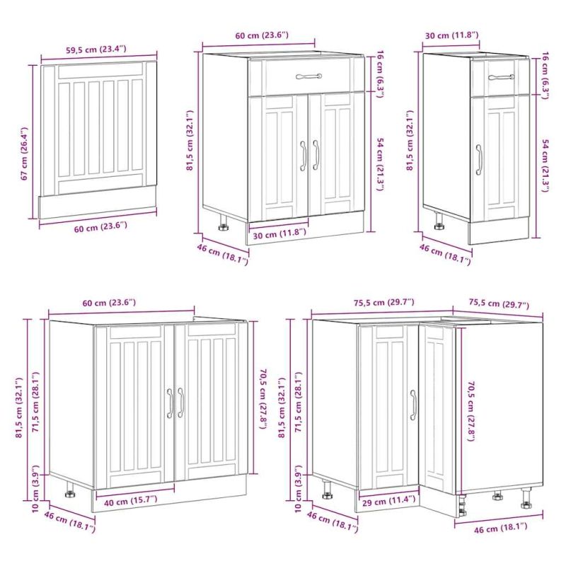 Този комплект кухненски шкафове от 11 части с елегантния си дизайн оптимизира кухненското ви пространство и осигурява достатъчно място за съхранение на вещите ви! Стабилен и издръжлив материал: Инженерната дървесина е издръжлив и стабилен материал с гладка повърхност, която е устойчива на влага, изкривяване и разцепване, което я прави надежден избор за различни проекти.Голямо пространство за съхранение: Комплектът кухненски шкафове има много отделения и предлага достатъчно място за съхранение на купи, чинии, тенджери и други кухненски уреди.Регулируеми крачета: Долните шкафове са снабдени с регулируеми крачета, чиято височина може да се регулира според разположението на кухнята.Лесна поддръжка: Благодарение на гладката си повърхност тези кухненски шкафове се почистват лесно с влажна кърпа и изискват по-малко поддръжка. Внимание:За да предотвратите преобръщане, този продукт трябва да се използва с предоставеното устройство за закрепване на стена. Добре е да се знае:Винт(ове) и щепсел(и) за вътрешността на стената не са включени. Търсете и използвайте винт(ове) и дюбел(и), подходящи за вашите стени. Ако не сте сигурни, потърсете професионална помощ. Прочетете и следвайте внимателно всяка стъпка от инструкциите.Работният плот, мивката и смесителят не са включени в доставката.