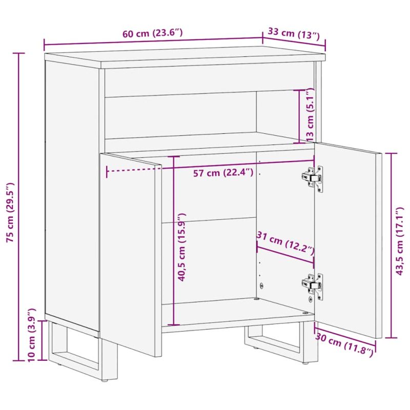 Организирайте пространството си с този бюфет, който е идеален за съхраняване на вещите ви на сигурно място, подредени и лесно достъпни във всяка обстановка. Здрав и стабилен материал: Масивното мангово дърво, здрава тропическа твърда дървесина, е силно предпочитано за производството на мебели поради изключителната си издръжливост и здравина. Красивите ѝ дървесни шарки правят всяка мебел малко по-различна от следващите.Метални крачета: Този шкаф се поддържа от здрави метални крачета, за да се гарантира стабилност, безопасност и устойчивост.Голямо пространство за съхранение: Този шкаф осигурява достатъчно място за съхранение, за да държите ежедневните си вещи добре организирани и на една ръка разстояние.Практична врата: Вратата на шкафа за съхранение осигурява затворено пространство за съхранение, за да бъдат вещите ви подредени, защитени и да не се виждат. Внимание:За да предотвратите преобръщане, този продукт трябва да се използва с предоставеното устройство за закрепване на стена. Добре е да се знае:Всеки артикул е уникален с вариации в цветове и зърна. Доставката е на случаен принцип, което гарантира ексклузивността и индивидуалността на вашия продукт.