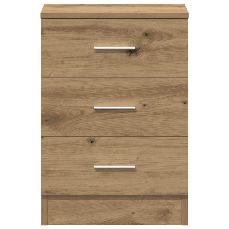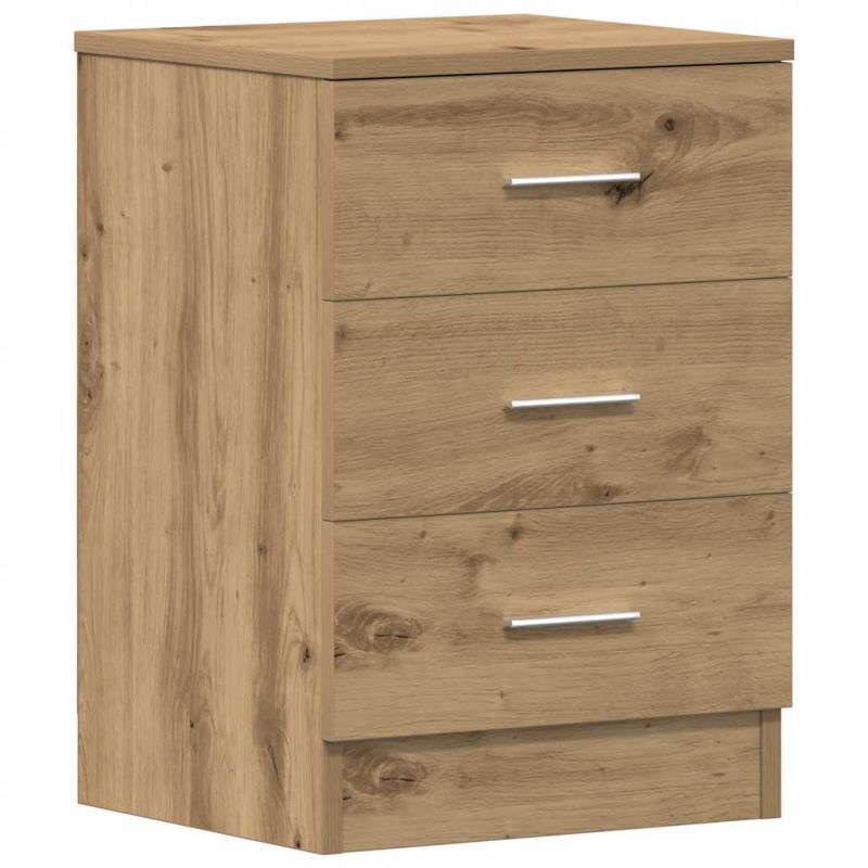 Това класическо нощно шкафче с атрактивен и практичен дизайн позволява ефективно решение за съхранение, като същевременно добавя великолепна декорация към вашия дом! Стабилен и издръжлив материал: Инженерната дървесина е издръжлив и стабилен материал с гладка повърхност, която е устойчива на влага, изкривяване и разцепване, което я прави надежден избор за различни проекти.Голямо пространство за съхранение: Шкафът за легло разполага с три чекмеджета, които осигуряват достатъчно място за подреждане на дребните предмети, които са лесно достъпни.Здрава горна част: Стабилният плот на нощното шкафче е идеален за поставяне на настолни лампи, будилници, книги, рамки за снимки, малки саксийни растения, декорации или други неща от първа необходимост.Универсална употреба: Това нощно шкафче не е предназначено само за спалнята, но може да се използва и като странична масичка в хола или като допълнително място за съхранение във всяка стая, като се адаптира безпроблемно към вашите нужди.Лесна поддръжка: Благодарение на гладката си повърхност нощното шкафче се почиства лесно с влажна кърпа и не изисква особена поддръжка.