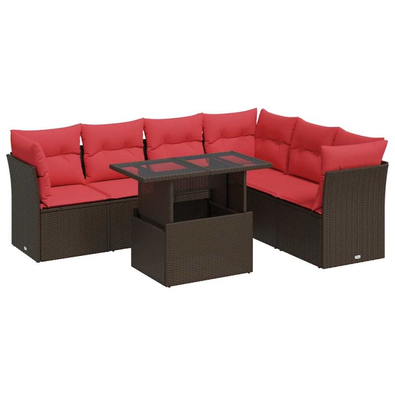 Градински диван с възглавници, 7 части, кафяв полиратан акация
