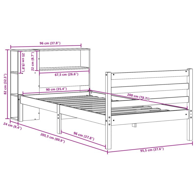Легло с рафтове за книги, без матрак, 90x200 см, бор масив