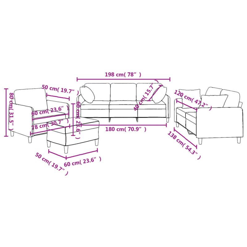 Този комплект дивани е отлично място за вашето време за разговори, четене, гледане на телевизия или просто почивка. Той е предназначен да бъде фокусна точка във вашия дом. Издръжлив текстил: Материята се отличава със семпъл и изчистен вид, като същевременно остава дишаща и дълготрайна.Здрава и стабилна рамка: Шперплатът и металната рамка на седалката на дивана осигуряват здравина и стабилност.Удобна седалка: Диванът е много удобен с дебело подплатената седалка, подлакътници и възглавници за гърба.Практични възглавници за диван: Тези квадратни декоративни възглавници не само освежават интериора, но и добавят допълнителен комфорт, докато седите или лежите.Функционална табуретка: Табуретката е подходяща за повдигане за крака, когато лежите на дивана, или ви предлага допълнително място за сядане във вашата стая. Освен това семплият дизайн и компактният размер я правят идеална за сядане почти навсякъде в жилищното ви пространство.