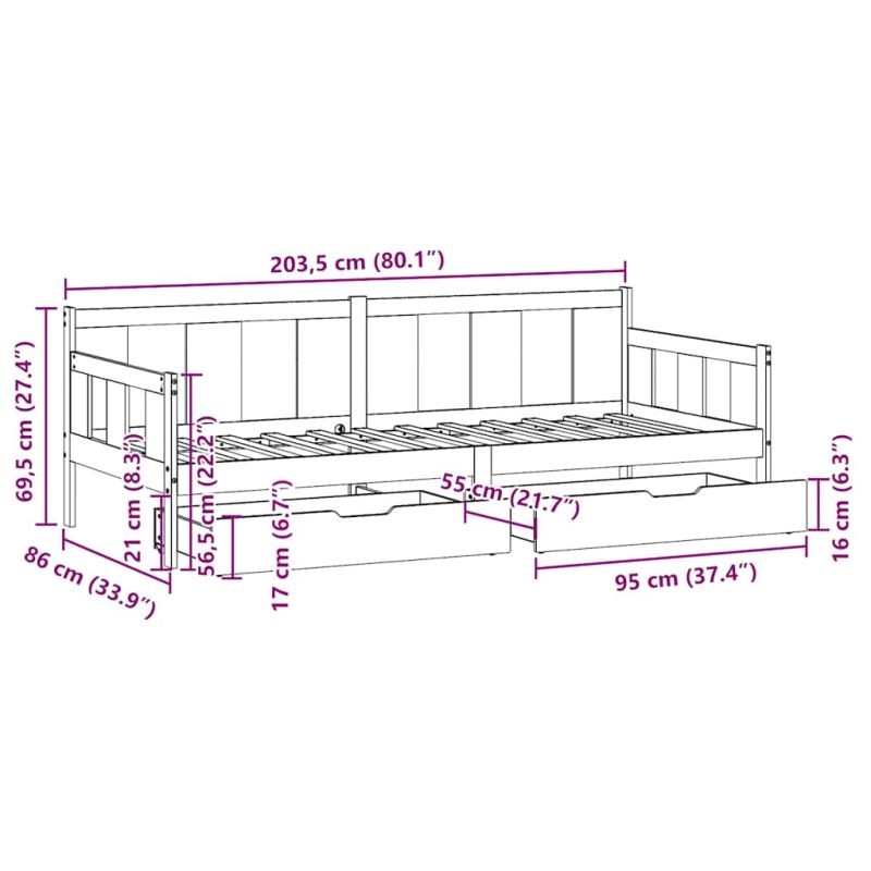 Това канапе 2-в-1 с чекмеджета, което служи едновременно като диван и легло, е практично и атрактивно допълнение към вашата всекидневна или спалня. Стабилна и дълготрайна рамка: Масивната борова дървесина е известна със своята здравина и издръжливост. Нейните прави зърна и отличителни възли допринасят за рустик чара ѝ.3-странни релси за легло: Това легло има уникален дизайн на страниците на леглото, осигурявайки чувство за сигурност и добавяйки нотка на изискан стил в дома ви.Ламели за оптимална опора: Диванът е снабден с ламели, за да предложи основна опора и дишане на вашия матрак.Рустик чар: Диванът придава на помещението ви рустикални нотки, които могат да бъдат наистина релаксиращи. Успокояващият ефект на дървеното дневно легло превръща всяка спалня и стая за гости в успокояващо място, същевременно добавяйки естествен елемент към стаята.Достатъчно място за съхранение: Това легло за гости има две чекмеджета, които осигуряват достатъчно място за съхранение на вашите дрехи, чорапи, играчки, възглавници и др. Добре е да се знае:Матраците не са включени в това легло. Ние предлагаме разнообразна селекция от матраци. Можете да проверите нашия магазин за подходящи матраци.