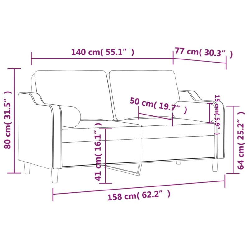 Този 2-местен диван, който се отличава с модерен дизайн и декоративни възглавници, ще бъде отлично място за разговори, гледане на телевизия или просто почивка. Издръжлив текстил: Материята се отличава със семпъл и изчистен вид, като същевременно остава дишаща и дълготрайна.Здрава и стабилна рамка: Металната рамка на тази мека мебел осигурява здравина и стабилност.Свалящи се калъфки за възглавници: Затварянето с цип позволява калъфките на тези възглавници лесни да бъдат свалени и изпрани, когато е необходимо.Удобна седалка: Диванът е много удобен с дебело подплатените седалки, подлакътниците и възглавниците за гърба. Освен това декоративните възглавници могат да добавят допълнителен комфорт, когато сте седнали или легнали.