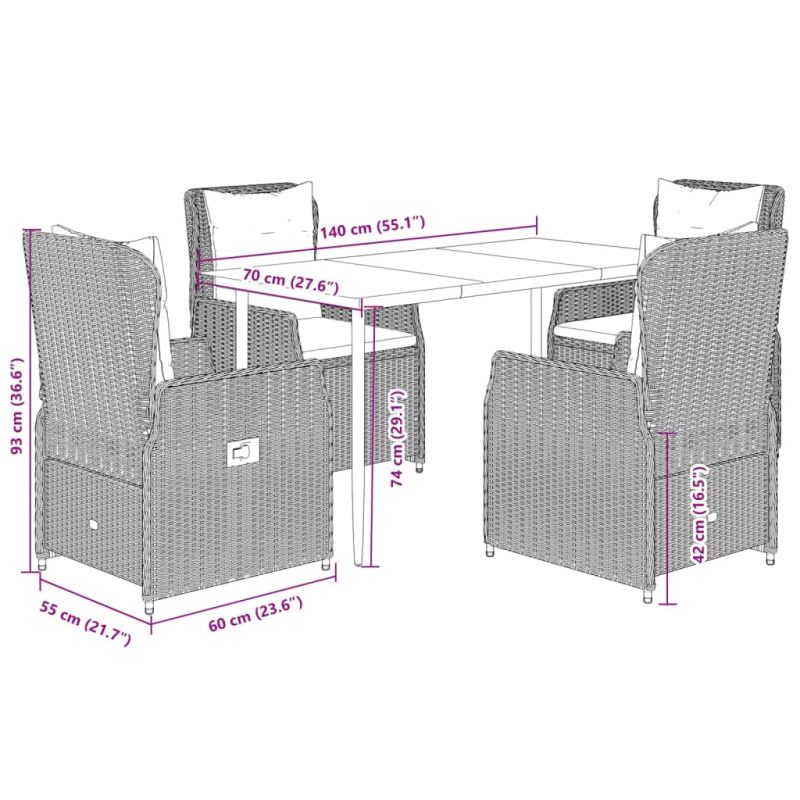 Този градински трапезен комплект е чудесен избор за вечеря на открито или просто за почивка в градината, задния двор или във вътрешния двор. Издръжлив материал: PE ратан, известен също като полиратан, е здрав синтетичен материал с малко необходима поддръжка, който прилича на естествен ратан. Той е лек, лесен за почистване и често се използва за външни мебели поради своята издръжливост и устойчивост на атмосферни влияния.Регулируема облегалка: Този градински стол има дръжка. Можете да регулирате облегалката във всяка позиция чрез издърпване на дръжката и бързо да я върнете в първоначалната ѝ позиция.Удобна седалка: Тази мебел за открито, снабдена с плътно подплатени възглавници, предлага удобство при сядане.Калъф, който може да се сваля и може да се пере: Възглавницата на седалката разполага с калъф, който може да се сваля за лесно пране и поддръжка.Стъклен плот: Плотът на външната маса е изработен от здраво и издръжливо закалено стъкло, което улеснява почистването с влажна кърпа и добавя нотка елегантност към вашето външно пространство. Добре е да се знае:За да сте сигурни, че вашите външни мебели ще останат красиви, ви препоръчваме да ги защитите с водоустойчиво покривало. Максимално 110 кг на седалка. Съобразете се с риска от открит огън и други източници на силна топлина в близост до продукта.