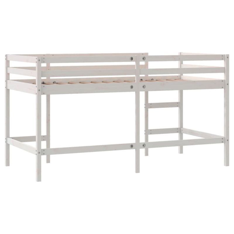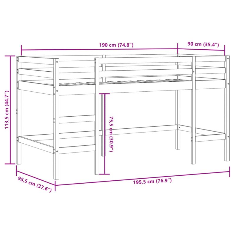 Това детско високо легло е изработено от борова дървесина масив и е предназначено както за забавление, така и за оптимизиране на пространството. Стабилна дървена конструкция: Това средновисоко легло е изработено от масивна борова дървесина за стабилност и издръжливост. Боровата дървесина е с продълговати шарки, а чеповете придават на материала характерния му рустик вид. Пълно използване на пространството: Това единично високо легло е повдигнато на 78,5 см над земята, осигурявайки достатъчно пространство отдолу за съхранение или други дейности. Тази зона може да се използва за подреждане на кутии за съхранение, съхраняване на големи играчки или дори за поставяне на детски диван за четене. Освен това вашето дете може да използва пространството под дървената рамка на леглото като тайна база и да се наслаждава на въображаема игра. Предпазни парапети: Детската спалня със средна височина се предлага с предпазни парапети от всичките 4 страни, така че детето ви да може да спи, без да се притеснявате, че ще падне. Удобна стълба: Това детско средно легло има стълба, която осигурява удобство за качване и слизане от леглото. Освен това носи радост и превръща стаята им в закрита детска площадка. Добре е да се знае:Към това легло не е включен матрак. Ние предлагаме разнообразна селекция от матраци. Можете да проверите нашия магазин за подходящ матрак. Внимание:За предотвратяване на преобръщане този продукт трябва да се използва с предоставения анкер за стена. ПРЕДУПРЕЖДЕНИЕ. Това легло не е подходящо за деца под шест години поради риск от нараняване при падане. ПРЕДУПРЕЖДЕНИЕ. Двуетажните легла/високите легла могат да представляват сериозен риск от нараняване от задушаване, ако не се използват правилно. Никога не прикрепвайте и не закачайте към която и да е част на двуетажното легло/високото легло предмети, които не са предназначени за използване с леглото, например, но не само въжета, конци, шнурове, куки, колани и чанти ПРЕДУПРЕЖДЕНИЕ. Децата могат да попаднат в капан между леглото и стената, скатния покрив, тавана, съседни мебели (напр. шкафове) и други подобни. За да се избегне рискът от сериозни наранявания, разстоянието между горната предпазна преграда и съседната конструкция не трябва да надвишава 75 мм или да е повече от 230 мм; ПРЕДУПРЕЖДЕНИЕ. Не използвайте двуетажното легло/високото легло, ако някоя конструктивна част е счупена или липсва. ПРЕДУПРЕЖДЕНИЕ. Този продукт трябва да бъде прикрепен към стена или строителна конструкция.
