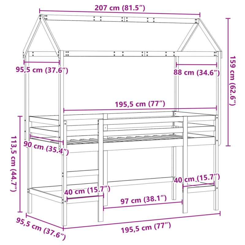 Това детско високо легло е изработено от борова дървесина масив и е предназначено както за забавление, така и за оптимизиране на пространството. Масивна борова дървесина: Масивната борова дървесина е красив естествен материал. Боровата дървесина е с продълговати шарки, а чеповете придават на материала характерния му рустик вид.Пълно използване на пространството: Това единично високо легло е повдигнато на 78,5 см над земята, осигурявайки достатъчно пространство отдолу за съхранение или други дейности. Тази зона може да се използва за подреждане на кутии за съхранение, съхраняване на големи играчки или дори за поставяне на детски диван за четене. Освен това вашето дете може да използва пространството под дървената рамка на леглото като тайна база и да се наслаждава на въображаема игра.Предпазни парапети: Детската спалня със средна височина се предлага с предпазни парапети от всичките 4 страни, така че детето ви да може да спи, без да се притеснявате, че ще падне.Удобна стълба: Това детско средно легло има стълба, която осигурява удобство за качване и слизане от леглото. Освен това носи радост и превръща стаята им в закрита детска площадка.Отворена странична врата: Покривът разполага с отворена странична врата, осигуряваща лесен достъп за вашите деца да влизат и стават от леглото. Добре е да се знае:Към това легло не е включен матрак. Ние предлагаме разнообразна селекция от матраци. Можете да проверите нашия магазин за подходящ матрак. Внимание:За да предотвратите преобръщане, този продукт трябва да се използва с предоставеното устройство за закрепване на стена. ПРЕДУПРЕЖДЕНИЕ. Това легло не е подходящо за деца под шест години поради риск от нараняване при падане ПРЕДУПРЕЖДЕНИЕ. Двуетажните легла/високите легла могат да представляват сериозен риск от нараняване от задушаване, ако не се използват правилно. Никога не прикрепвайте и не закачайте към която и да е част на двуетажното легло/високото легло предмети, които не са предназначени за използване с леглото, например, но не само, въжета, струни, шнурове, куки, колани и чанти ПРЕДУПРЕЖДЕНИЕ. Децата могат да попаднат в капан между леглото и стената, скатния покрив, тавана, съседни мебели (напр. шкафове) и други подобни. За да се избегне рискът от сериозни наранявания, разстоянието между горната предпазна преграда и прилежащата конструкция не трябва да надвишава 75 мм или трябва да е повече от 230 мм ПРЕДУПРЕЖДЕНИЕ. Не използвайте двуетажното легло/високото легло, ако някоя конструктивна част е счупена или липсва. ПРЕДУПРЕЖДЕНИЕ. Този продукт трябва да бъде прикрепен към стена или строителна конструкция.