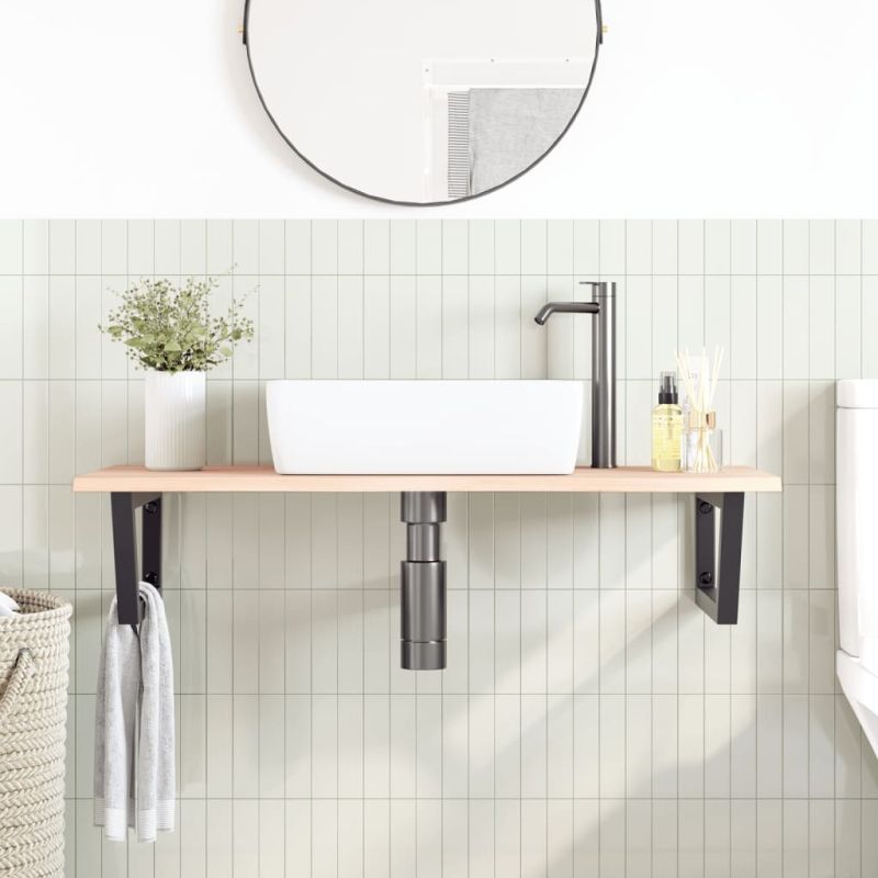 Стенният рафт за мивка се прикрепя сигурно към стената, осигурявайки елегантно и спестяващо място решение за вашата баня. Здрав и дълготраен: Този рафт за мивка е комбиниран със стоманена конструкция и плот от масивна дъбова дървесина, което го прави здрав, стабилен и дълготраен.Спестяване на място: Плаващият рафт за мивка има достатъчно място за съхранение на кремове и дребни предмети. Благодарение на трапецовидната форма можете да закачите кърпи или други неща на опората, за да спестите място.Лесен за използване: Плотът се доставя без дупки, за да позволи на мивката да се монтира отляво, отдясно или в центъра, в зависимост от изискванията на вашето помещение. Благодарение на предварително пробитите отвори в държача, той може лесно да се сглоби с плота и да се монтира на стената.Широки приложения: Благодарение на модерния си дизайн, осигурява допълнително пространство за различни видове бани. Добре е да се знае:Винтовете не са включени, можете да закупите винтовете отделно въз основа на информацията, предоставена по-долу.Прикрепване към стена: 2 бр дюбели M8 на скобаДървен плот: 2 бр M5x18 винта (T=2) или 2 бр M5x20 винта (T=2,5/4 см) на скобаКато естествен продукт, дървото може да има възли и несъвършенства, които ние запълваме с черни пълнежи, за да осигурим гладък външен вид.