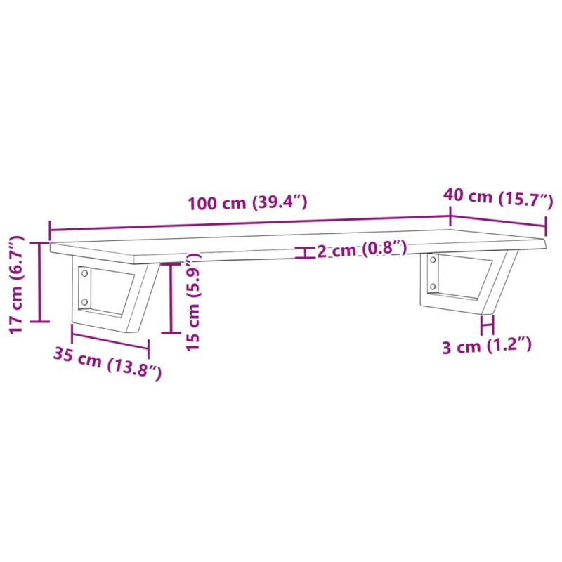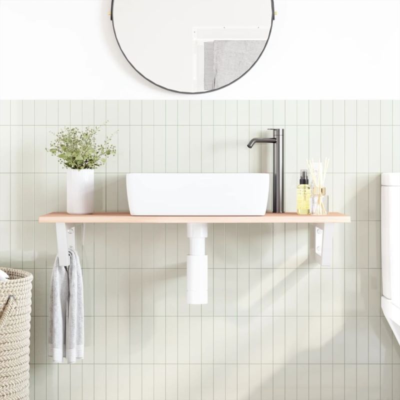 Стенният рафт за мивка се прикрепя сигурно към стената, осигурявайки елегантно и спестяващо място решение за вашата баня. Здрав и дълготраен: Този рафт за мивка е комбиниран със стоманена конструкция и плот от масивна дъбова дървесина, което го прави здрав, стабилен и дълготраен.Спестяване на място: Плаващият рафт за мивка има достатъчно място за съхранение на кремове и дребни предмети. Благодарение на трапецовидната форма можете да закачите кърпи или други неща на опората, за да спестите място.Лесен за използване: Плотът се доставя без дупки, за да позволи на мивката да се монтира отляво, отдясно или в центъра, в зависимост от изискванията на вашето помещение. Благодарение на предварително пробитите отвори в държача, той може лесно да се сглоби с плота и да се монтира на стената.Широки приложения: Благодарение на модерния си дизайн, осигурява допълнително пространство за различни видове бани. Добре е да се знае:Винтовете не са включени, можете да закупите винтовете отделно въз основа на информацията, предоставена по-долу.Прикрепване към стена: 2 бр дюбели M8 на скобаДървен плот: 2 бр M5x18 винта (T=2) или 2 бр M5x20 винта (T=2,5/4 см) на скобаКато естествен продукт, дървото може да има възли и несъвършенства, които ние запълваме с черни пълнежи, за да осигурим гладък външен вид.