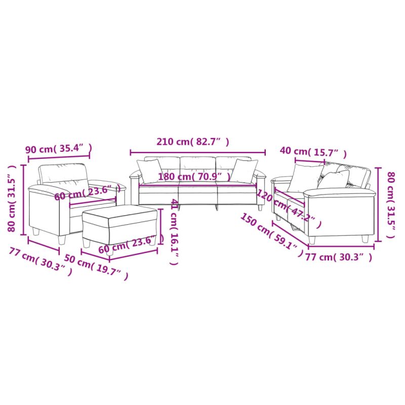Този комплект дивани е отлично място за вашето време за разговори, четене, гледане на телевизия или просто почивка. Той е предназначен да бъде фокусна точка във вашия дом. Издържлив микрофибър: Микрофибърът е синтетична тъкан, състояща се от ултрафини влакна, които са особено устойчиви на петна. Микрофибърната тъкан е чудесен избор за мебелна тапицерия, благодарение на своята издръжливост и лесно почистване.Здрава и стабилна рамка: Шперплатът и металната рамка на седалката на дивана осигуряват здравина и стабилност.Удобна седалка: Диванът е много удобен с дебело подплатената седалка, подлакътниците и възглавницата за гърба.Практични възглавници за диван: Тези квадратни декоративни възглавници не само освежават интериора, но и добавят допълнителен комфорт, докато седите или лежите.Функционална табуретка: Табуретката е подходяща за повдигане за крака, когато лежите на диван, или ви предлага допълнително място за сядане във вашата стая. Освен това семплият дизайн и компактният размер я правят идеална за сядане почти навсякъде в жилищното ви пространство.