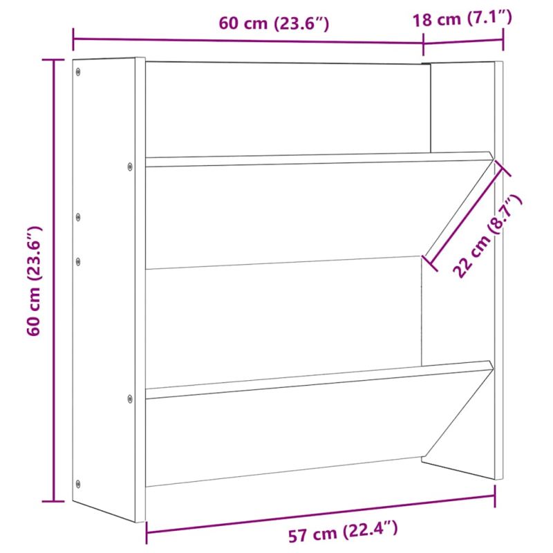 Съхранявайте обувките си подредени и винаги подръка с модерния стенен шкаф за обувки! Той се отличава с изчистен дизайн, който може лесно да се впише в настоящото ви жизнено пространство. Шкафът за обувки е оборудван с 2 накланящи се рафта, където да съхранявате обувките, ботушите и чехлите си организирано и подредено. Тази поставка за обувки се монтира към стената, с което може да спести място, за да направи входа към дома ви добре организиран и да поддържа пода чист. Може да се фиксира на желаната от вас височина. Освен това органайзерът за обувки се почиства лесно с влажна кърпа.