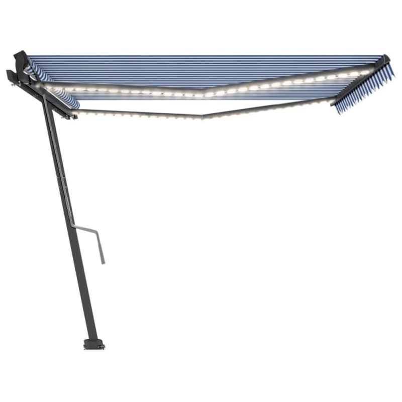 Ръчно прибиращ се сенник с LED, 450x350 см, синьо и бяло