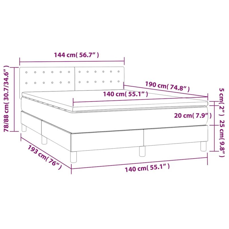 Използвайте това боксспринг легло с матрак и LED, за да се насладите на спокоен сън! Това е централната точка на вашата спалня. Меко кадифе: Кадифето е мека и луксозна материя, която се отличава с гъста купчина равномерно отрязани влакна за гладка повърхност. Кадифената тъкан се отличава с меко усещане, което я прави приятна на допир.Практична табла за глава: Горната табла за легло се регулира на височина според вашите предпочитания. Горната част на леглото ви осигурява отлична опора за гърба, докато седите в леглото, за да четете или гледате телевизия.Цветна LED лента: Внесете игриви нотки в тъмнината с цветни LED светлини!Покет пружинен матрак: Вградените индивидуални покет пружини са известни с много високото си качество, като същевременно осигуряват високо ниво на издръжливост и адаптивност. Те могат ефективно да абсорбират шума и ударите, причинени от мятане и въртене.Благоприятен за кожата топ матрак: Протекторът за матрак има издръжлива, както и щадяща кожата материя, което я прави мека и удобна. Забележка:От хигиенни съображения матракът не може да бъде върнат, ако опаковката е отстранена или отворена.Всеки продукт се доставя с ръководство за сглобяване в кашона за лесно сглобяване.Само частта със символ на ножица може да бъде изрязана и само частта с USB ще продължи да функционира както преди.Продуктът има USB конектор, но не е включен сертифициран източник на захранване от 5V USB. Този продукт се захранва с DC 5V, но сертифицираният 5V USB източник на захранване не е включен в комплекта. По-високото напрежение може да доведе до прегряване на устройството и да доведе до повреда на устройството и потенциален риск от прегряване и пожар.