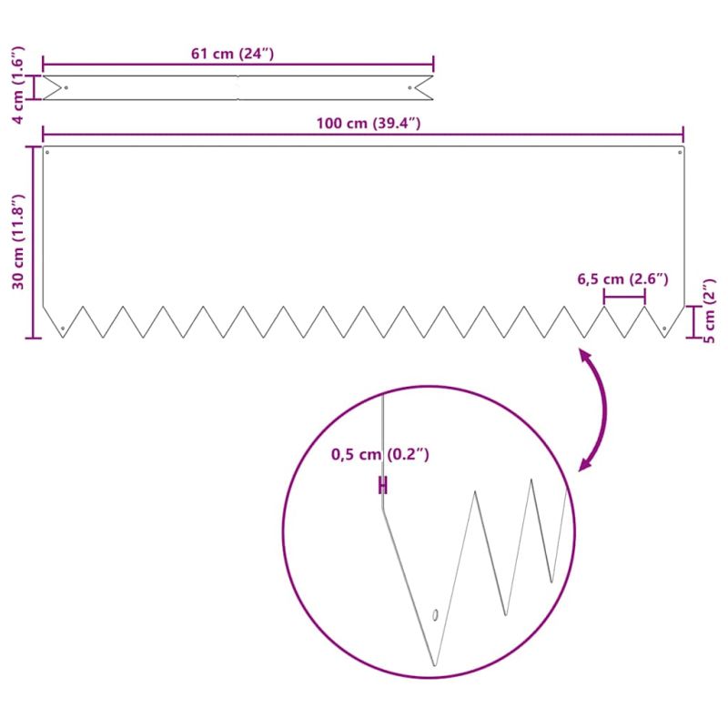 Този градински бордюр предлага стилно и удобно решение за разделяне на местата във външната ви зона. Идеален е за градини и тераси, като създава ясна линия между тревата, цветята и пътеките, организирайки пространството и придавайки му естетика. Модерният дизайн се вписва лесно в различни стилове и подобрява общия вид на градината, правейки поддръжката по-лесна. Устойчив материал: Бордюрът е направен от издръжлив материал, който не се поддава на времето. Проектиран да издържа, той запазва формата и вида си независимо от дъжд, слънце или вятър, предоставяйки надеждност през всички сезони. Модерен дизайн: С чисти линии и минималистичен стил, този бордюр придава съвременен вид на вашите открити пространства. Простият и ефективен дизайн добавя нотка на лукс към всяка градина или тераса. Подобрена функция: Този бордюр осигурява ясно разграничение между различни зони, предпазвайки пътеките от нахлуваща трева. Предлага естетически и практични ползи, намалявайки усилията по поддръжка и подобрявайки визията на ландшафта. Универсална употреба: Идеален за алеи, около цветя или в зоните на патио, този бордюр е адаптивен към разнообразие от оформления и стилове на градинарство. Неговият елегантен изглед и здравина го правят подходящ за всякакви резидентни и комерсиални ландшафти. Основна инсталация: Монтажът е лесен и изисква чук и помощ за стабилно поставяне. Процесът на инсталация гарантира, че бордюрът остава сигурен и функционален, осигурявайки уплатнени граници на вашите открити зони.